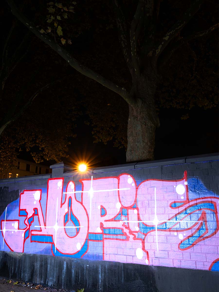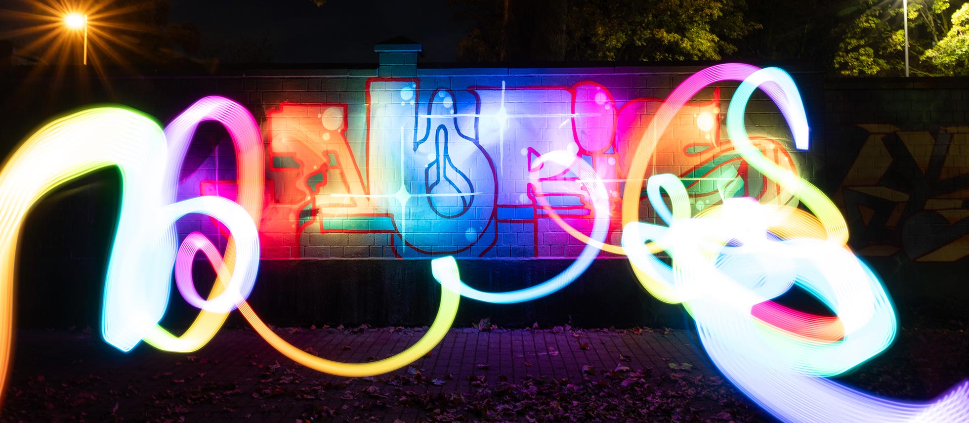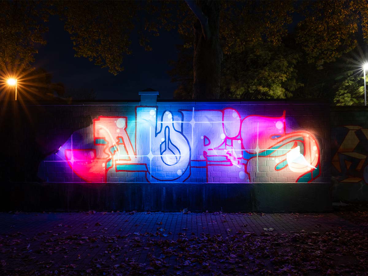 Nachtfotografie lebt vom Spiel mit Licht und Dunkelheit. Gegenstände lassen sich hervorragend hervorheben, indem man sie mit einer externen Lichtquelle anstrahlt. Besonders spannend wird das Ergebnis, wenn man mit buntem Licht arbeitet, da die Farben dem Bild zusätzliche Tiefe und eine einzigartige Atmosphäre verleihen. Dabei ist es wichtig, so präzise wie möglich auszuleuchten, da jeder Fehler auf dem Bild sichtbar wird. In unserem ersten Bild haben wir das Graffiti mit einfachem weißen Licht beleuchtet. Das zweite Bild war etwas aufwendiger: Mit der Farbwechselfunktion der Patona Premium LED RGB-Leuchte haben wir den Schriftzug aus etwa 15 cm Entfernung nachgefahren. So wird nur der Schriftzug hervorgehoben, während die Farbwechsel für interessante visuelle Akzente sorgen. Die lange Belichtungszeit sorgt dafür, dass die Person, die das Licht geführt hat, nicht im Bild zu sehen ist, da sie sich während der Aufnahme bewegt hat.