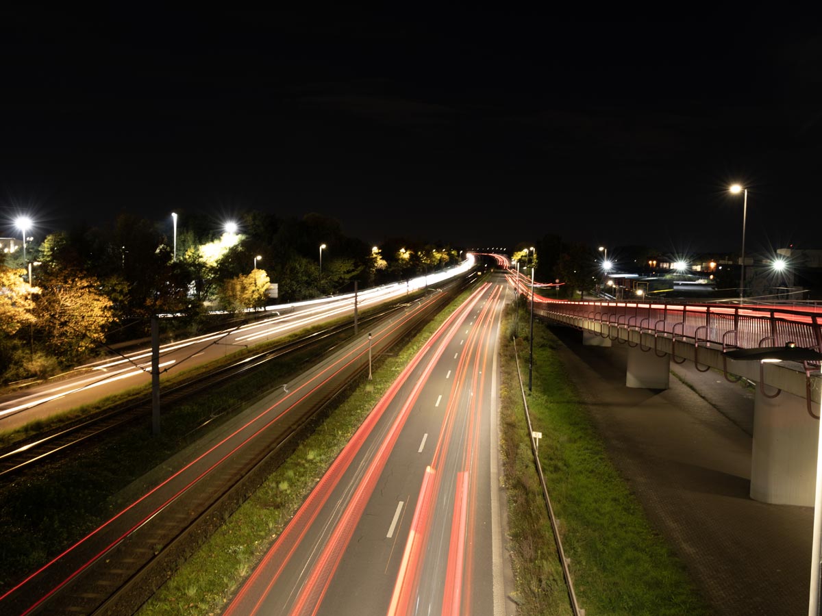 Für unser Bild haben wir uns auf eine Brücke gestellt, die über eine Autobahnauffahrt führt. Das Besondere ist, dass zwischen zwei Autospuren noch die Straßenbahn verläuft. Achten Sie beim Fotografieren genau darauf, wo Sie sich hinstellen. Eine stark befahrene Brücke mag zwar augenscheinlich der perfekte Ort sein, doch die entstehenden Vibrationen führen auch zu verwackelten Bildern.