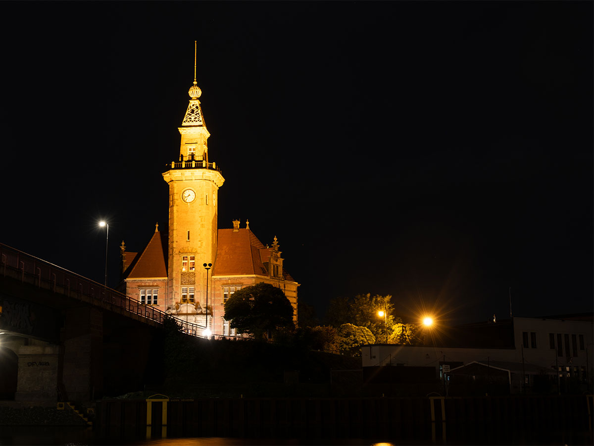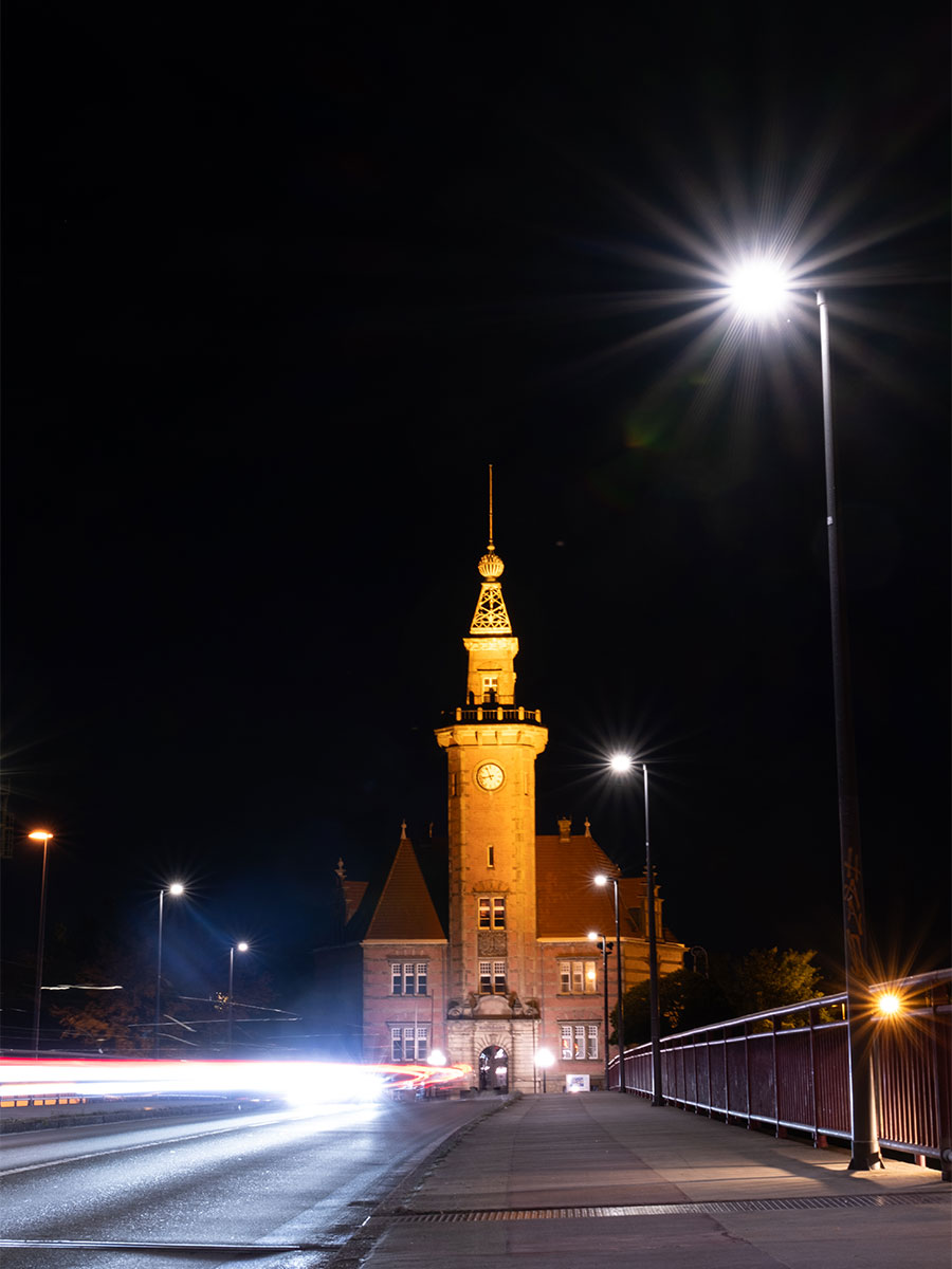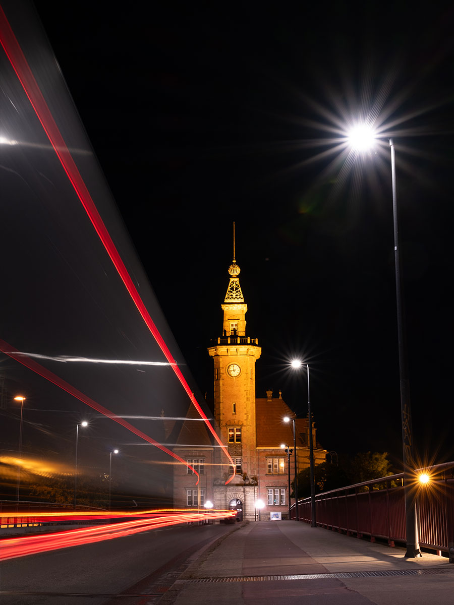 Lichtspuren lassen sich auch hervorragend als Ergänzung in Architekturfotografien einsetzen. In unserem Beispiel sieht man das beleuchtete Alte Hafenamt in Dortmund, dessen Wirkung durch die auf das Gebäude zulaufenden Lichtspuren verstärkt wird. Diese Dynamik lässt das Bild lebendiger und spannender wirken. Für diese Aufnahme hat sich das Warten gelohnt: Die weißen Lichter der entgegenkommenden Fahrzeuge hätten das Bild möglicherweise gestört. Stattdessen verleihen die roten Rückleuchten eines Busses der Szene eine besondere Atmosphäre.