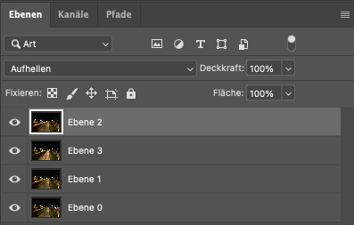In unserem Beispielbild haben wir zudem ein wenig getrickst: Wir haben den geringen Verkehr vermehrt, indem wir mehrere Einzelbilder in Photoshop übereinandergelegt und den Ebenen-Mischmodus auf „Aufhellen“ gestellt haben. Hierbei werden nur die Lichtspuren addiert. Wichtig ist, dass die Kamera zwischen den Aufnahmen nicht bewegt wird.