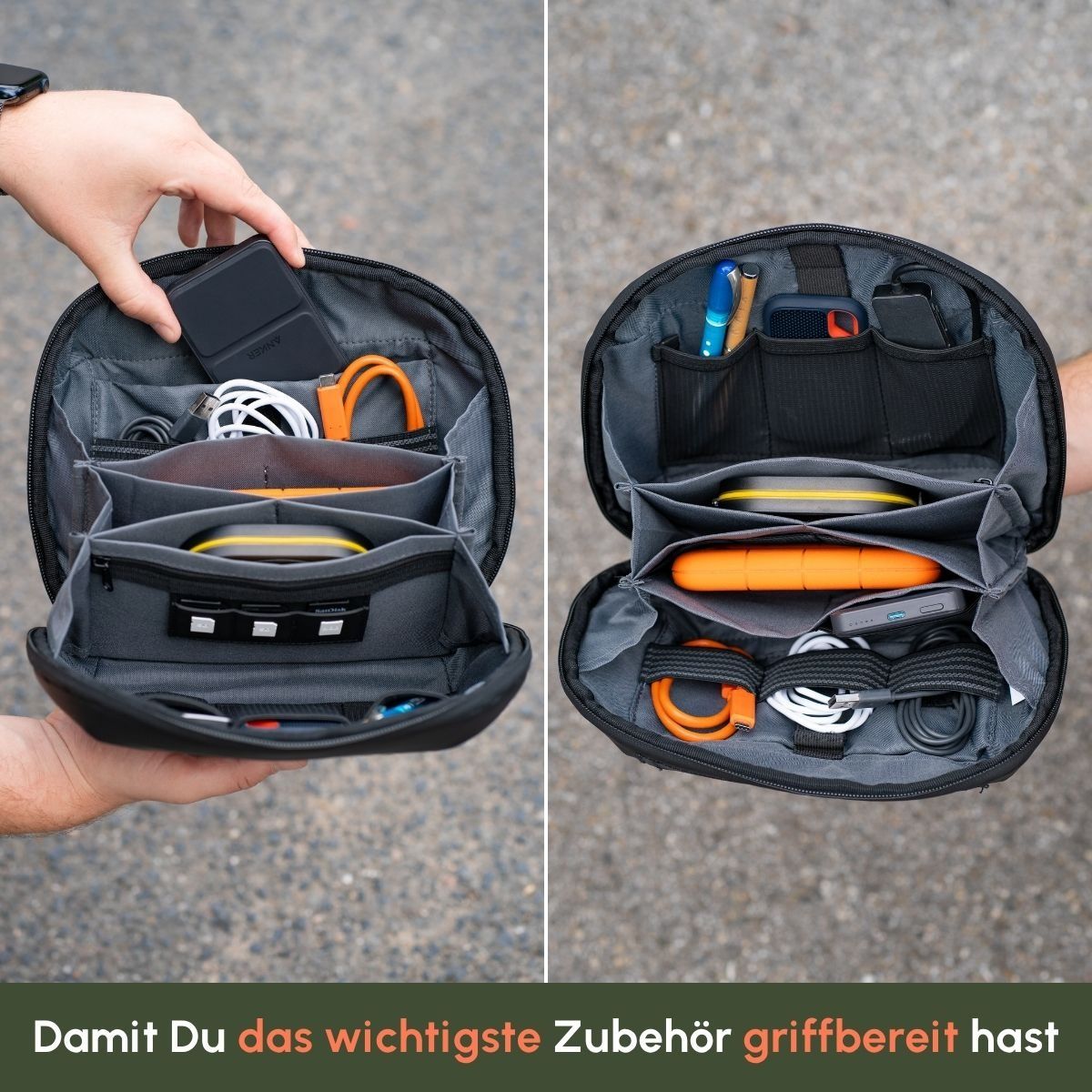 Der C-Rope Premium Elektronik Organizer M verfügt über eine robuste Hard-Case-Struktur mit stoßabsorbierender Polsterung. Diese Konstruktion schützt elektronische Geräte wie Powerbanks, Festplatten oder Ladegeräte zuverlässig vor mechanischen Einflüssen und sorgt für maximale Sicherheit während des Transports.