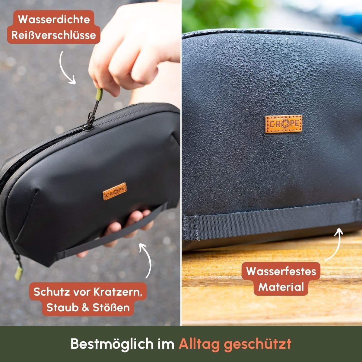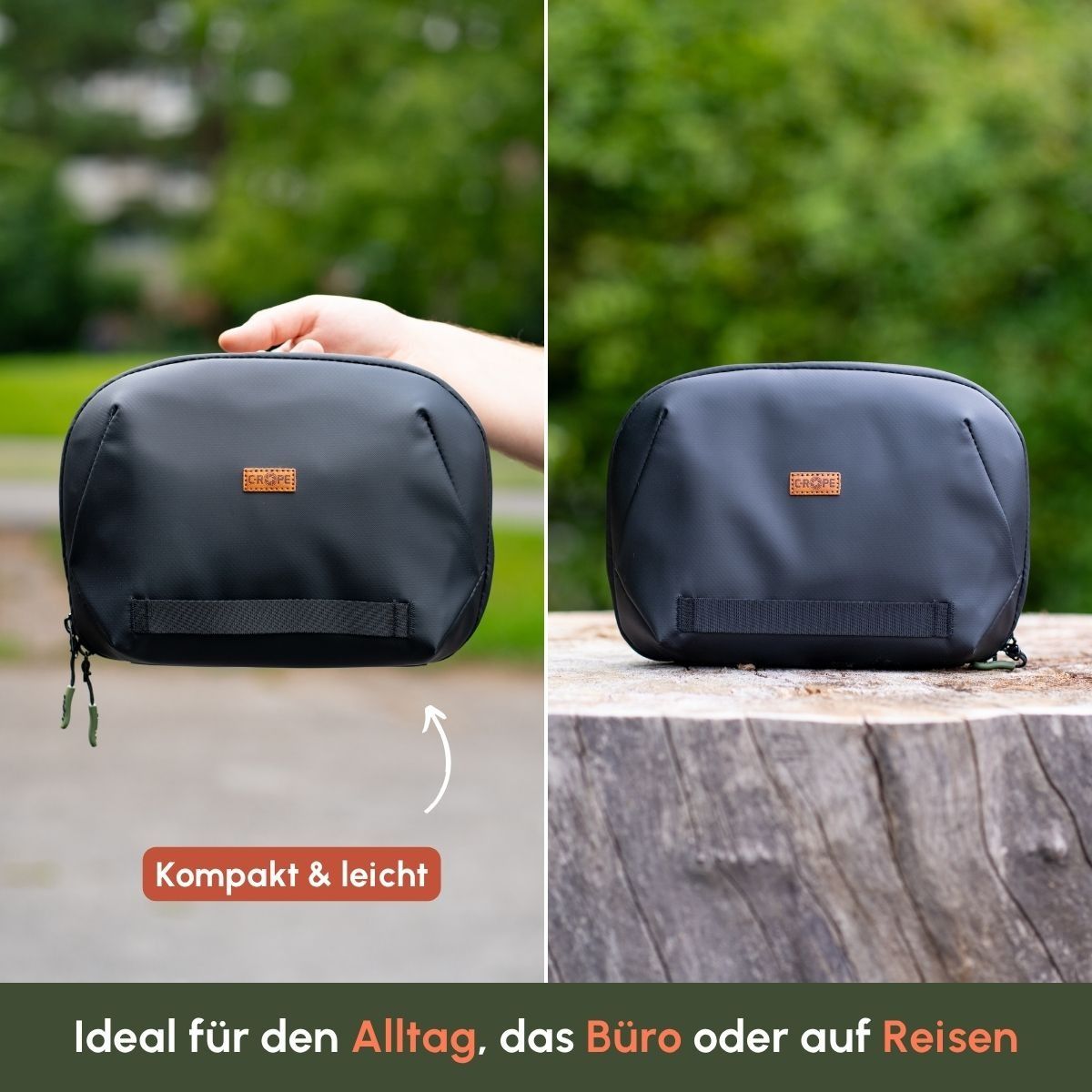 Das wasserfeste Außenmaterial und die wasserdichten Reißverschlüsse bieten zuverlässigen Schutz bei Regen oder hoher Luftfeuchtigkeit. Dadurch eignet sich der Organizer perfekt für den Einsatz auf Reisen, im Outdoor-Bereich oder in feuchten Umgebungen.