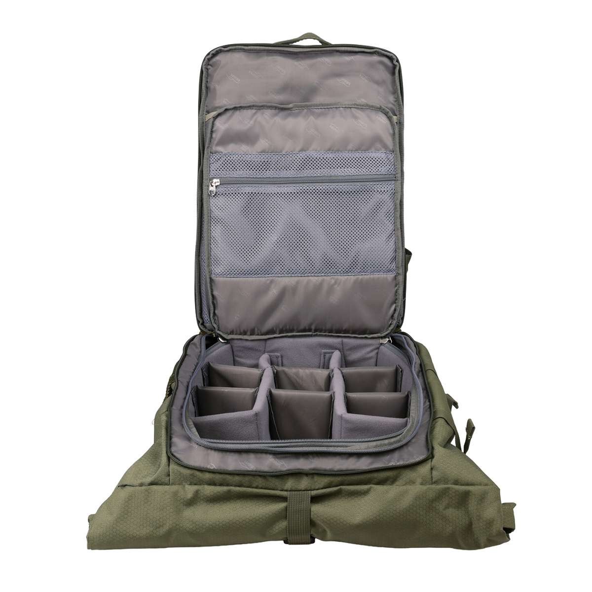 Der im Hauptfach integrierte Fotoeinsatz bietet individuell einteilbare Fächer zur sicheren Aufbewahrung von Kamera, Objektiven und Zubehör. Dank rückseitigem Zugriff ist die Ausrüstung schnell erreichbar, ohne den gesamten Rucksack öffnen zu müssen.