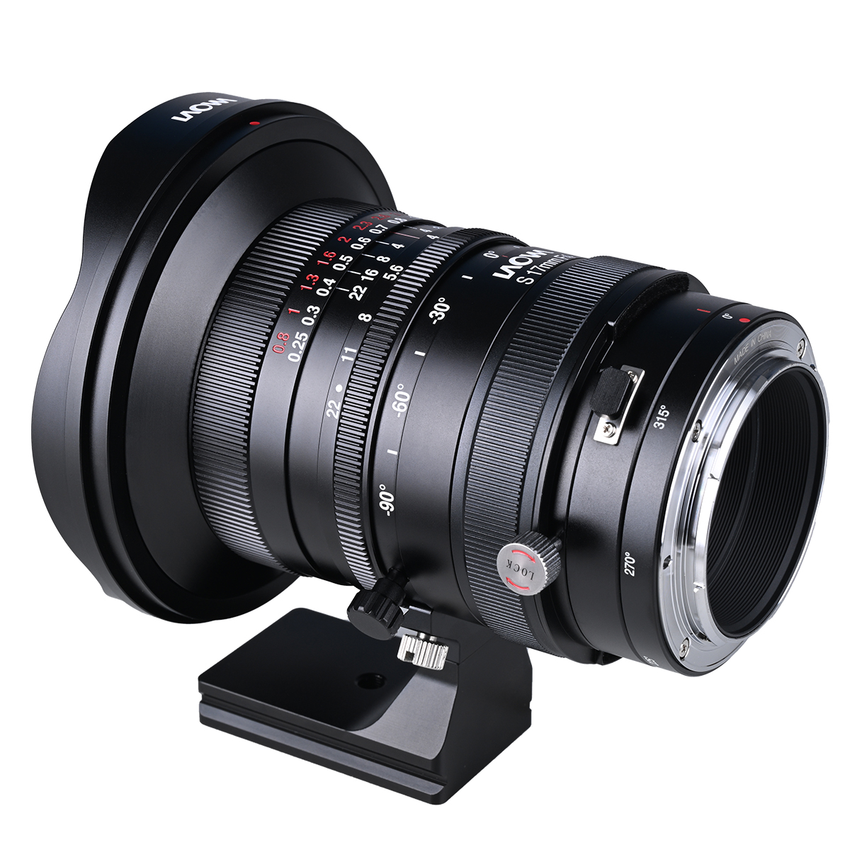 Das Objektiv verfügt über zwei unabhängige Rotationssysteme. Der Kamerabajonett-Anschluss kann um 360° gedreht werden und rastet alle 15° ein, wodurch eine präzise Ausrichtung der Shift-Achse möglich wird. Zusätzlich lässt sich das Objektiv über die integrierte Stativschelle stufenlos um 360° drehen und fixieren, wodurch eine flexible Anpassung an unterschiedliche Aufnahmesituationen erreicht wird.
