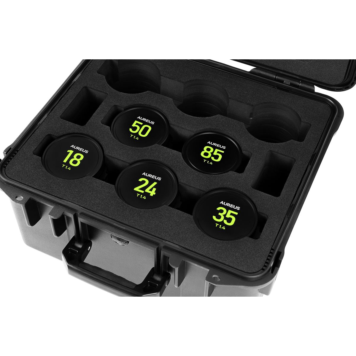 - Passgenaue Schaumstoffeinlage: Sicherer Halt der Aureus Prime Cine-Objektive, verhindert Bewegungen und Beschädigungen.