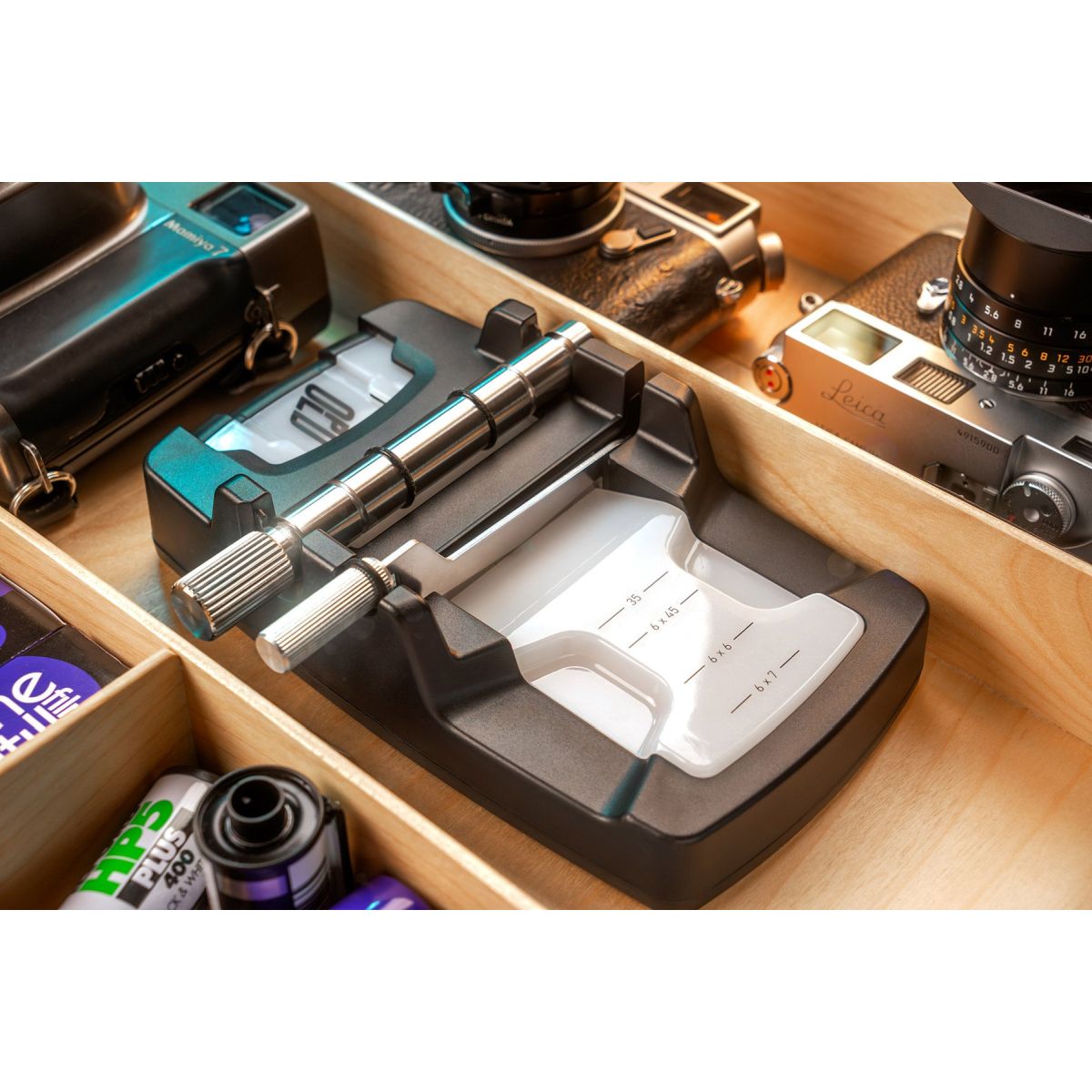 Der Filmschneider ist für den präzisen Zuschnitt analoger Fotofilme konzipiert und bietet einen kontrollierten, rutschfesten Filmtransport. Die Konstruktion ist auf eine gleichmäßige Führung ausgelegt und unterstützt eine exakte Positionierung des Films während des Schneidevorgangs. Durch die Kompatibilität mit unterschiedlichen Filmformaten eignet sich das System für verschiedene analoge Workflows.