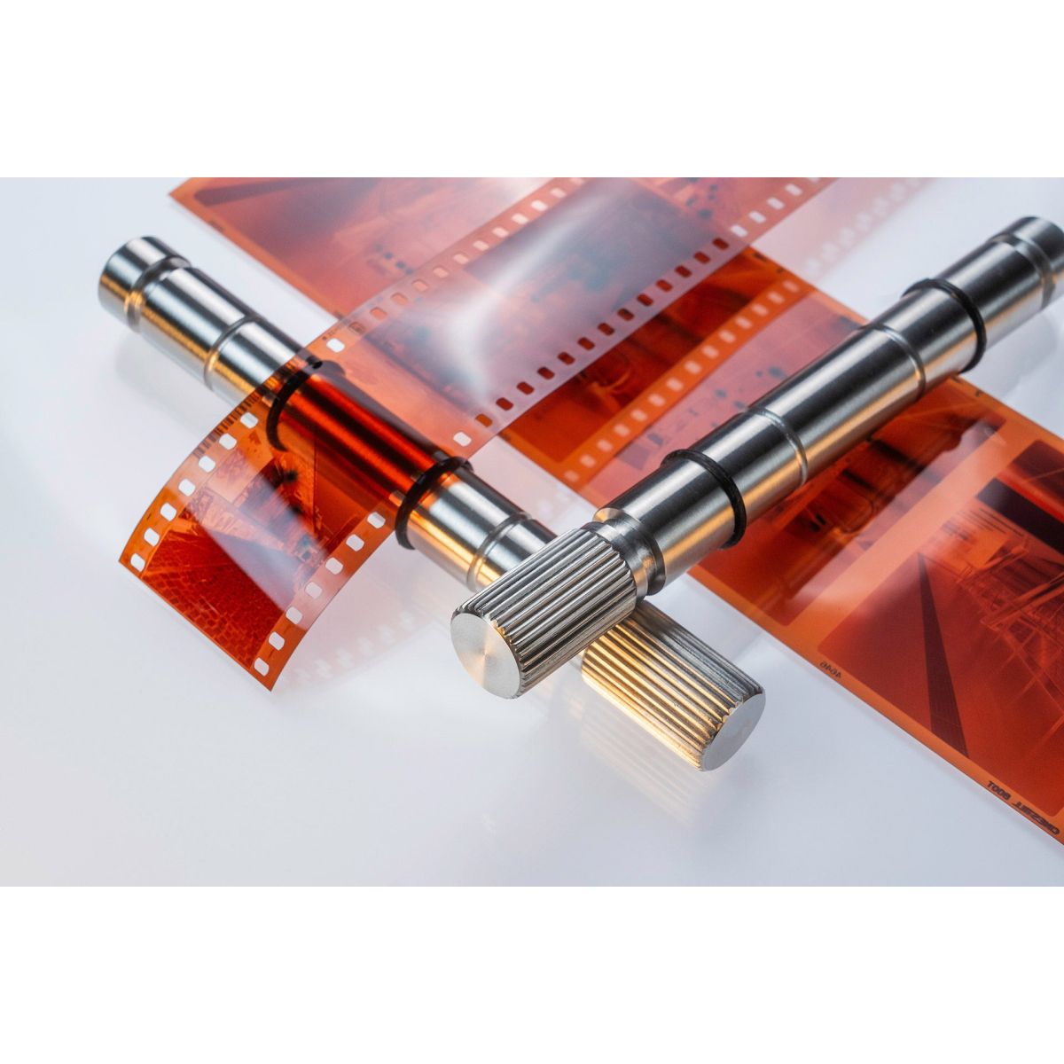 Die Antriebswelle besteht aus rostfreiem Edelstahl und verfügt über eine präzise Rändelung. Diese Konstruktion unterstützt eine sichere Handhabung und trägt zu einem kontrollierten Transport des Films bei. Die verwendeten Materialien sind auf Langlebigkeit und gleichmäßige Performance ausgelegt.