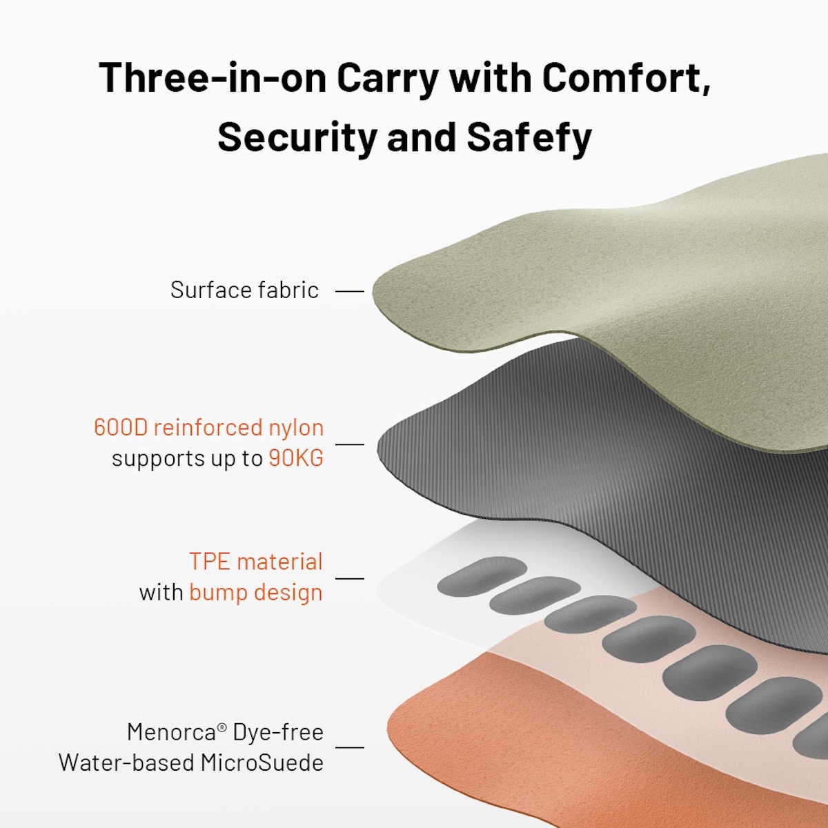 Der Schultergurt besteht aus Menorca®-Mikrofaser, die eine hohe Farbechtheit und Lichtbeständigkeit gewährleistet. Die Kombination mit 600D verstärktem Nylon sorgt für eine Tragfähigkeit bis 90 kg. Die Materialien erfüllen die OEKO-TEX® STANDARD 100-Zertifizierung für Babyprodukte, was die Umweltverträglichkeit unterstreicht. Das TPE-gefütterte Schulterpolster bietet gleichzeitig Komfort und Schutz vor Druckstellen.