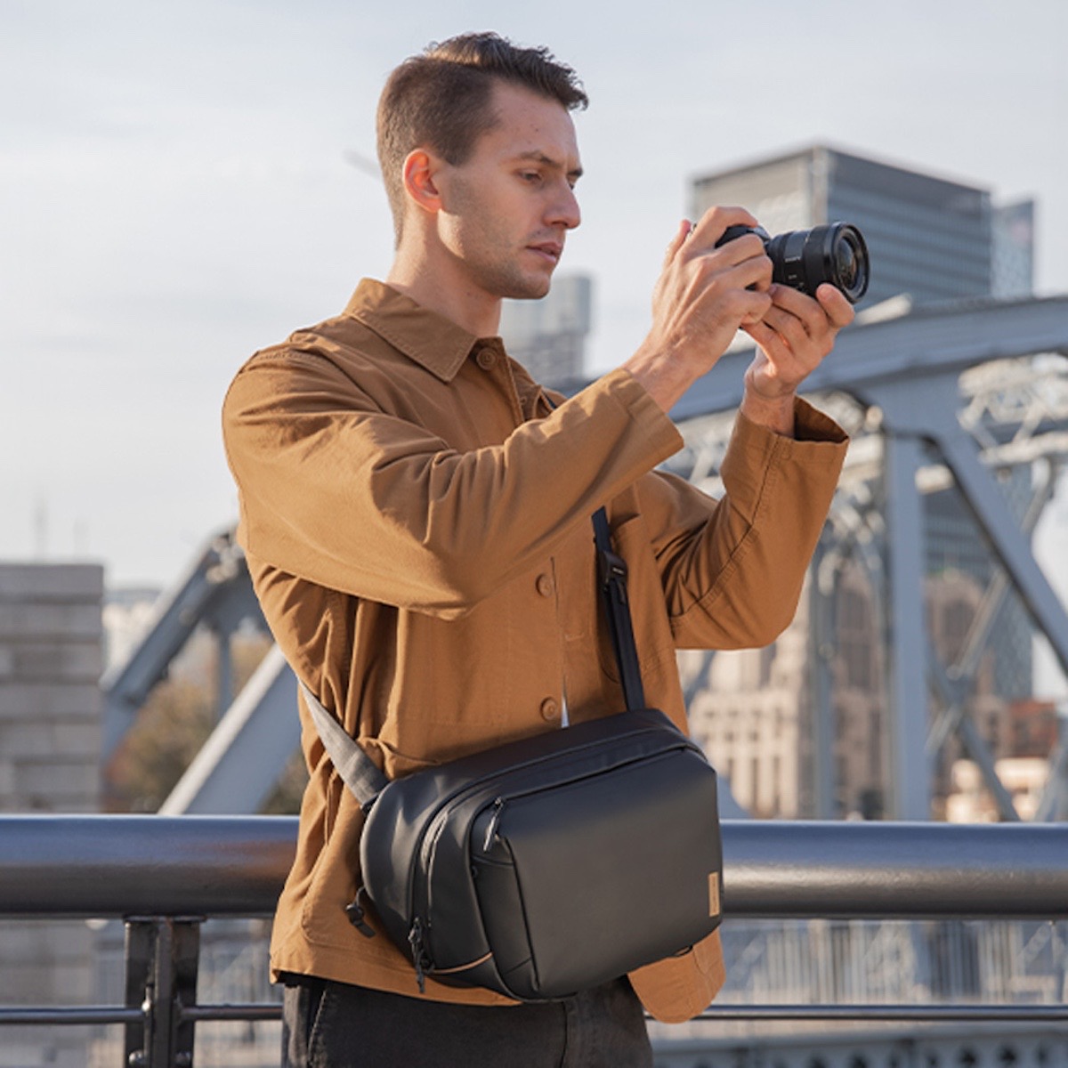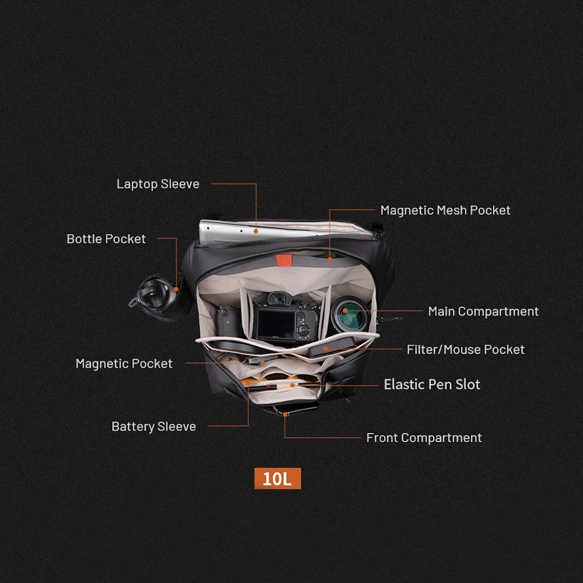 Der PGYTech OneGo Solo V2 10L eignet sich für den täglichen Pendelverkehr, Reisen und Fotografieeinsätze. Er bietet ausreichend Platz für Kameraequipment, Laptop und persönliche Gegenstände, während Trennwände und Taschen eine geordnete Aufbewahrung gewährleisten.