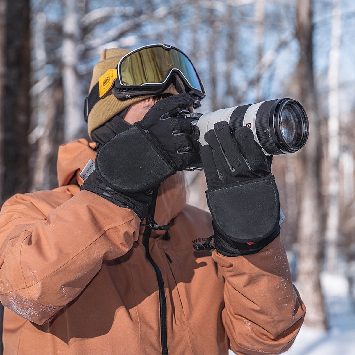 Das Flip-Design der Fingerkappe erlaubt schnellen Zugriff auf die Kamera oder Drohne. Mit drei exponierten Fingern können präzise Handbewegungen ausgeführt werden, während gleichzeitig der Wärmeverlust minimiert wird.