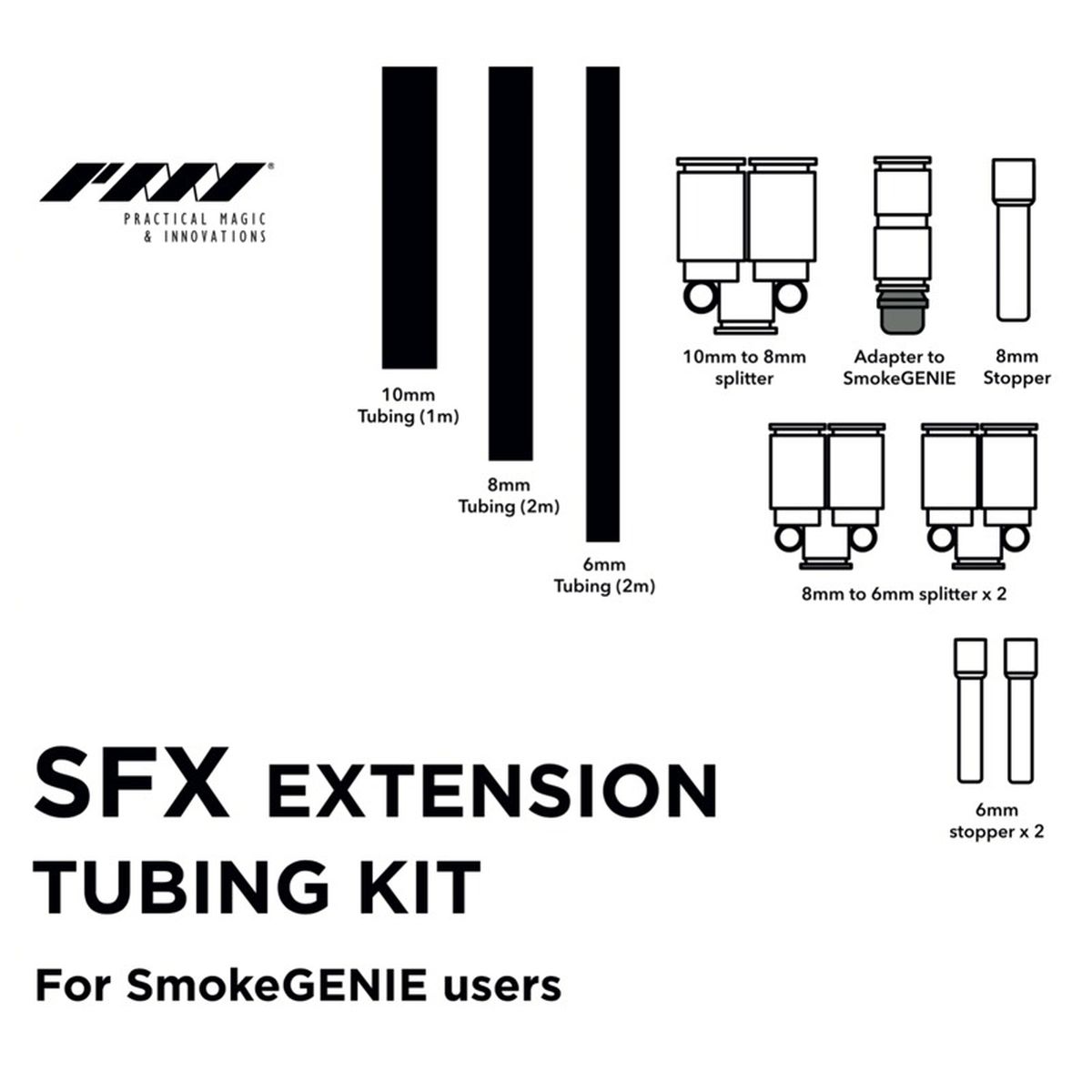 Splitter, Stopper und ein Adapter für Smoke GENIE erweitern die Einsatzmöglichkeiten des Sets. So lassen sich Nebelströme teilen, stoppen oder gezielt weiterleiten, wodurch präzise Nebeleffekte realisiert werden können.