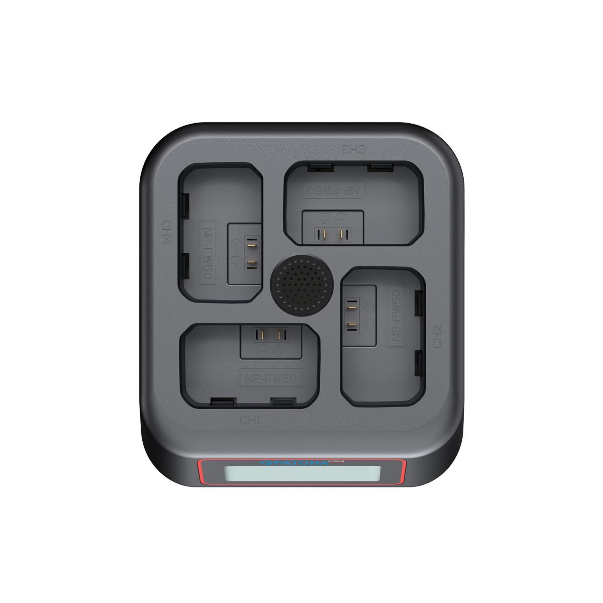 Das Ladegerät ermöglicht das gleichzeitige Laden von bis zu vier Sony NP-FW50 Akkus. Die parallele Ladefunktion sorgt für eine effiziente Energieversorgung mehrerer Akkus und reduziert Ladezeiten im Vergleich zu Einzel-Ladegeräten.