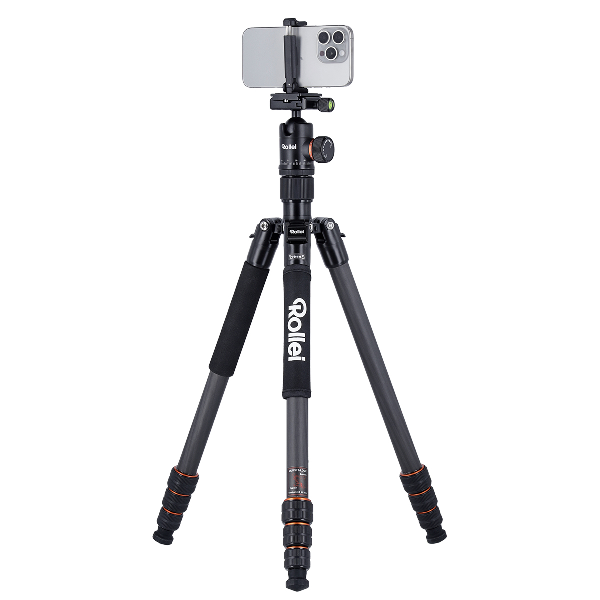 Das Rollei C5i Stativ Carbon Schwarz bietet zahlreiche zusätzliche Funktionen für unterschiedliche Aufnahmesituationen. Ein Stativbein kann zu einem Monopod umgebaut werden, wodurch sich das Stativ auch für dynamische Aufnahmen eignet. Die teilbare Mittelsäule ermöglicht bodennahe Perspektiven, während austauschbare Spikes und Gummifüße für sicheren Stand auf unterschiedlichen Untergründen sorgen. Zusätzlich erlaubt die integrierte Smartphone-Halterung die Nutzung mit mobilen Geräten.