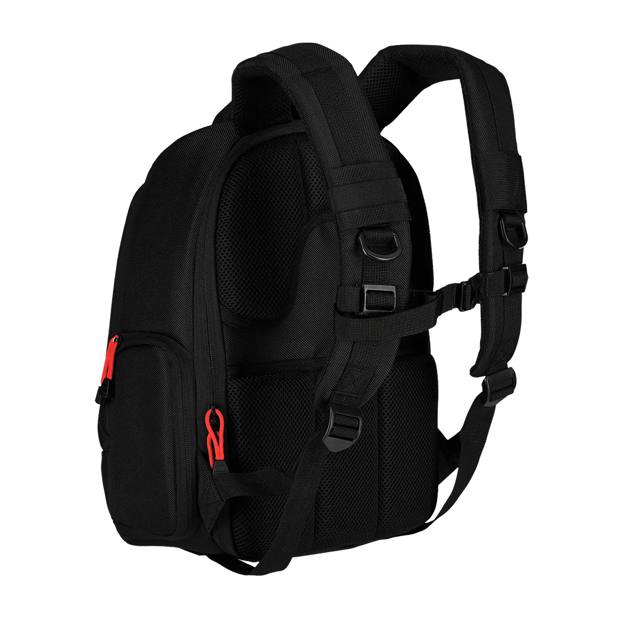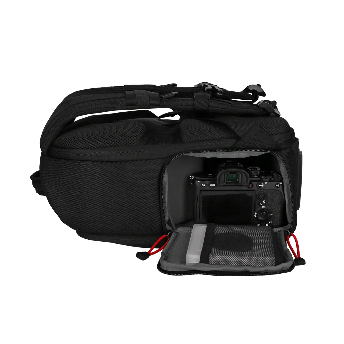 Der Zugriff auf das Kamera-Hauptfach erfolgt über die Rückseite. Zusätzlich steht ein seitlicher Schnellzugriff zur Verfügung. Eine Netztasche an der Seite bietet Platz für kleine Trinkflaschen, während eine Stativhalterung an der Frontseite angebracht ist. Ein separates Tabletfach ist für Geräte bis 7,9 Zoll ausgelegt.