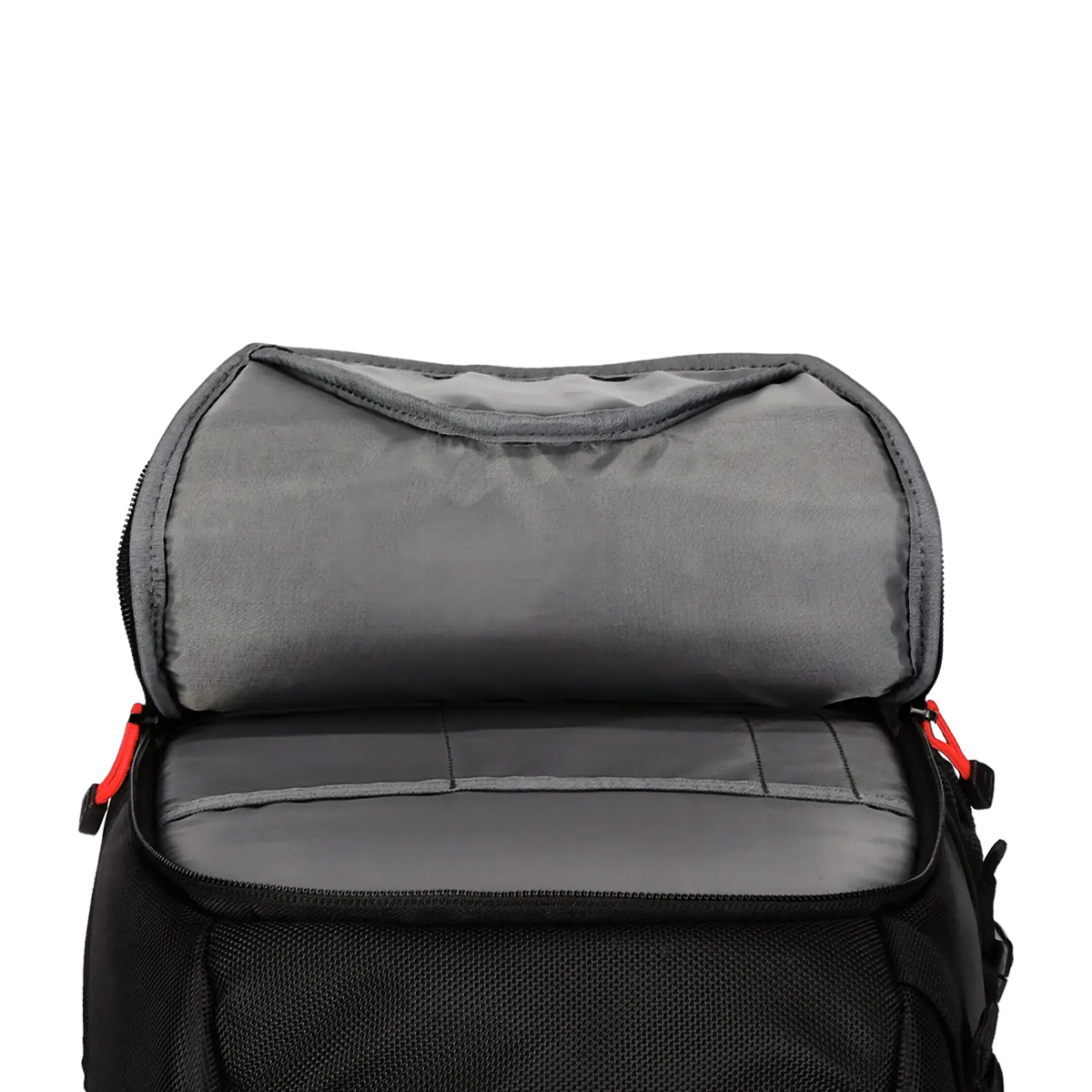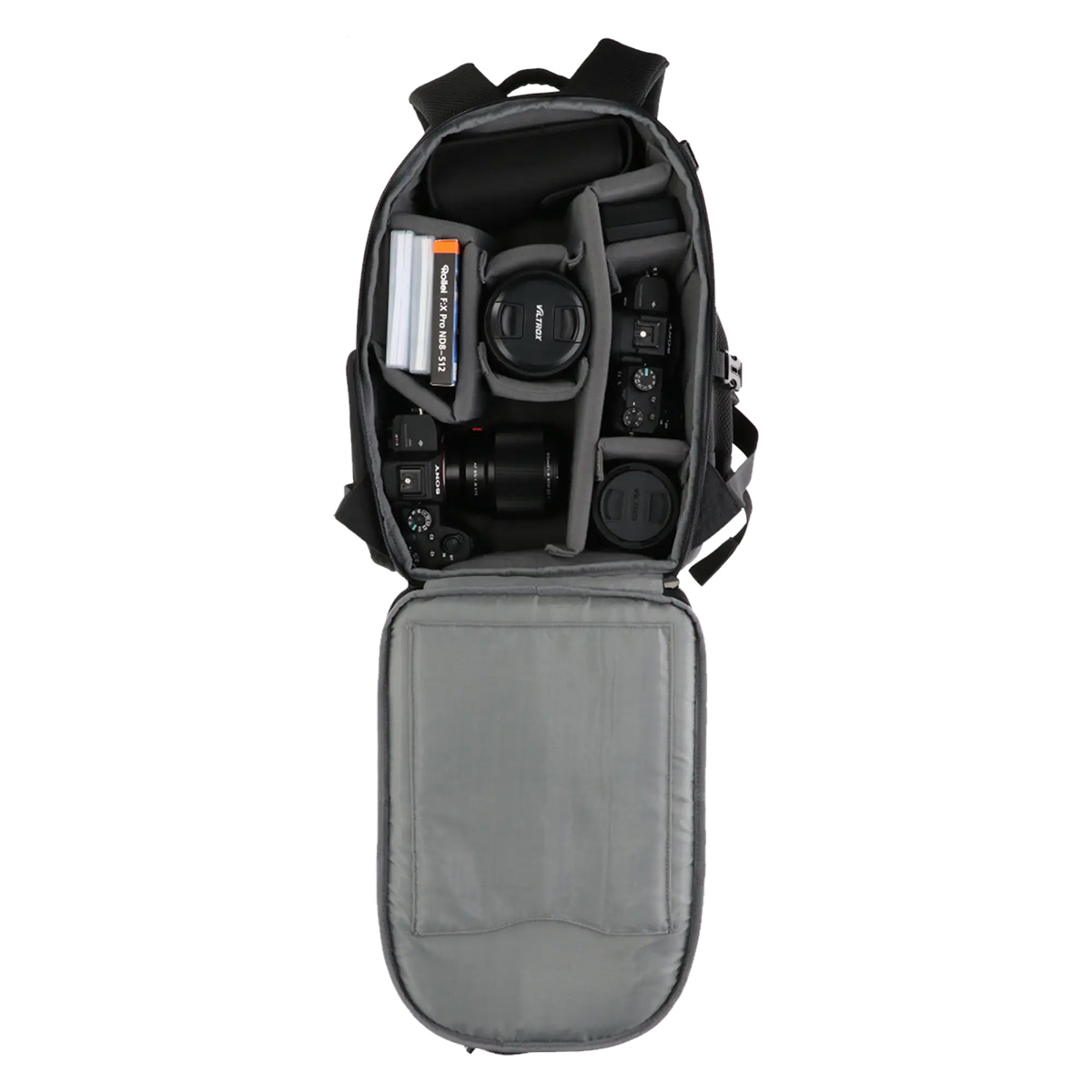 Das Hauptfach bietet Platz für bis zu zwei DSLR- oder DSLM-Kameras mit Objektiven. Versetzbare Trennwände mit Klettsystem ermöglichen eine individuelle Anpassung des Innenraums. Zusätzliche Fächer an Vorderseite und Innenbereich erlauben eine strukturierte Organisation von Zubehör wie Speicherkarten oder Kleinteilen.