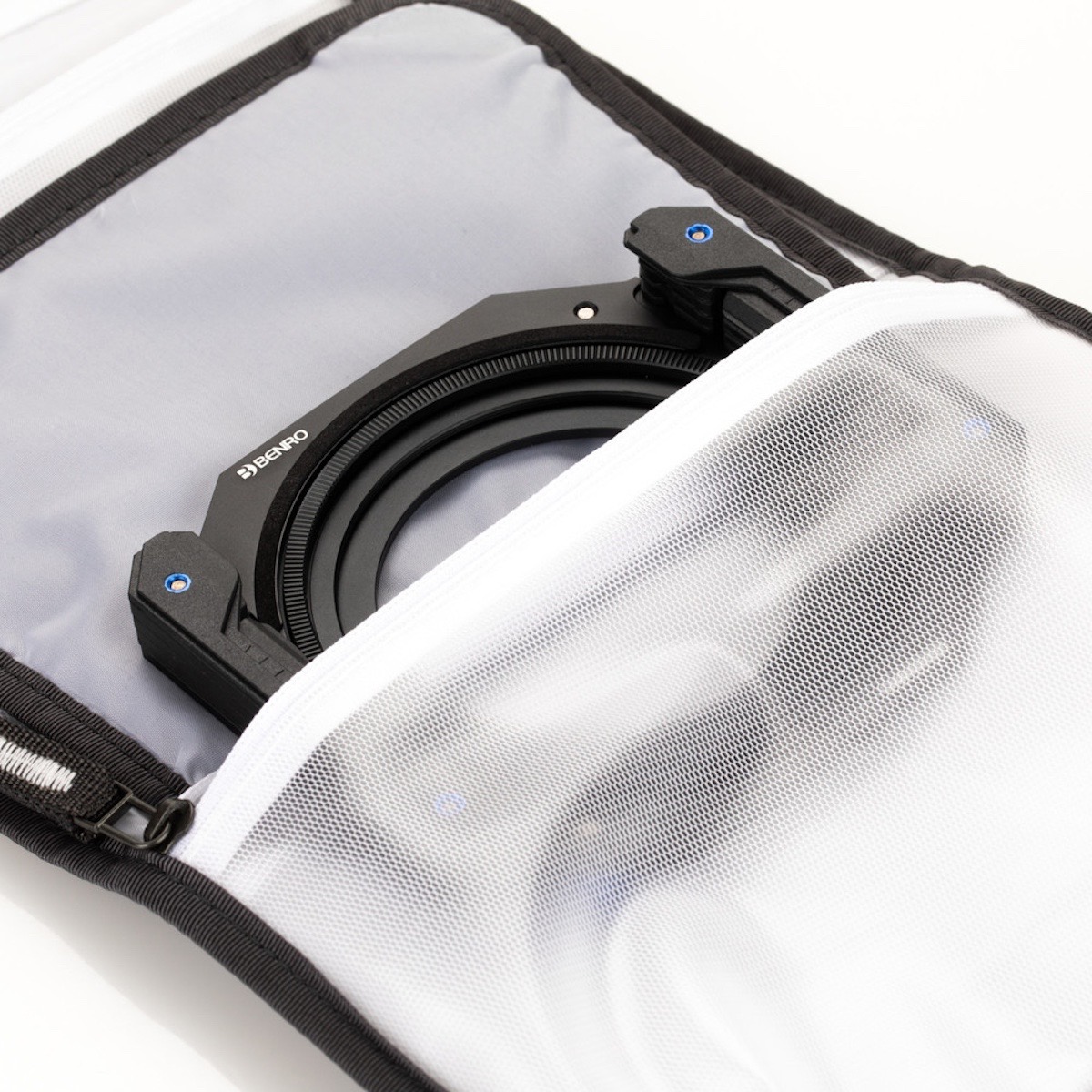 Die vier Netzfächer mit Reißverschluss bieten Platz für bis zu sechs große Filter sowie Zubehör wie Objektivtücher oder Step-up-Ringe. Durchsichtige Materialien und weiße Innenfutter erleichtern das schnelle Auffinden von Filtern nach Farbe und Dichte.