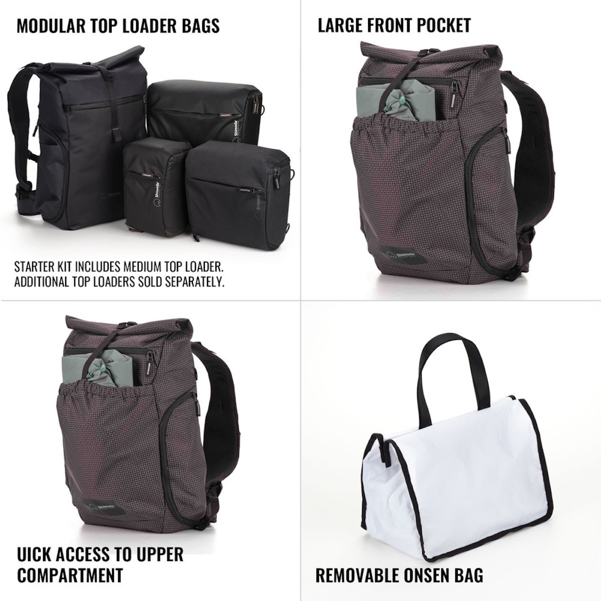 Das Starter-Kit beinhaltet den Medium Top Loader, der als Kameraeinsatz im Rucksack, als separate Sling-Tasche oder als Hüfttasche genutzt werden kann. Dieses modulare System erlaubt eine anpassbare Nutzung je nach Ausrüstungsbedarf und bevorzugtem Tragekonzept.