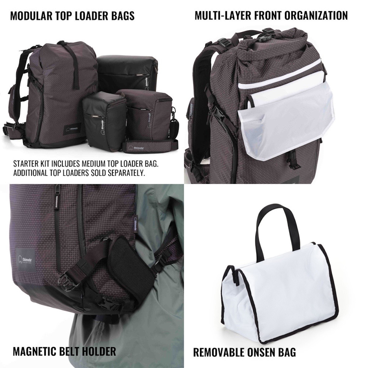 Das Shimoda Sidecountry Starter Kit nutzt ein modulares Design, das mehrere Konfigurationen ermöglicht. Der enthaltene Medium Top Loader Kameraeinsatz lässt sich im Rucksack nutzen, separat als Sling oder als Hüfttasche mit dem Rucksackgurt befestigen. So passt sich das System flexibel an wechselnde Aufnahmesituationen und Transportbedürfnisse an.