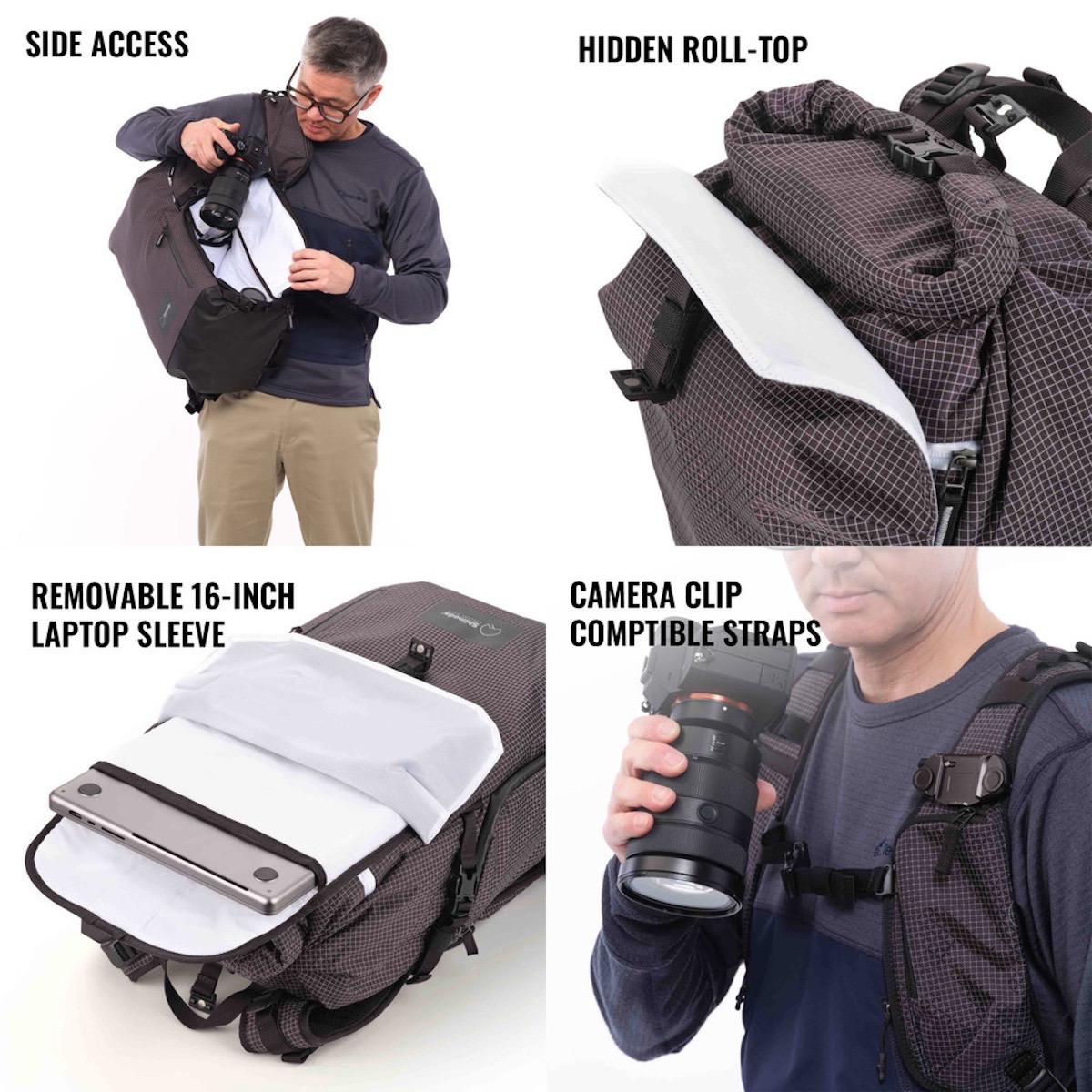 Der ausschließlich seitliche Zugang des Rucksacks bietet schnellen Zugriff auf Kamera und Objektive, ohne den Rucksack vollständig öffnen zu müssen. Die Konstruktion ist bewusst leicht gehalten, ohne Kompromisse bei der Funktionalität einzugehen. Alle Shimoda Top Loader (S/M/L) sind damit kompatibel.