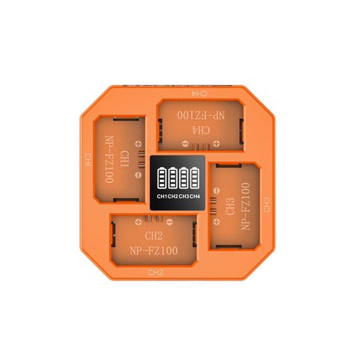 - Vier Ladeanschlüsse: Gleichzeitiges Laden von bis zu vier NP-FZ100-Akkus zur Steigerung der Effizienz bei professionellen Einsätzen.