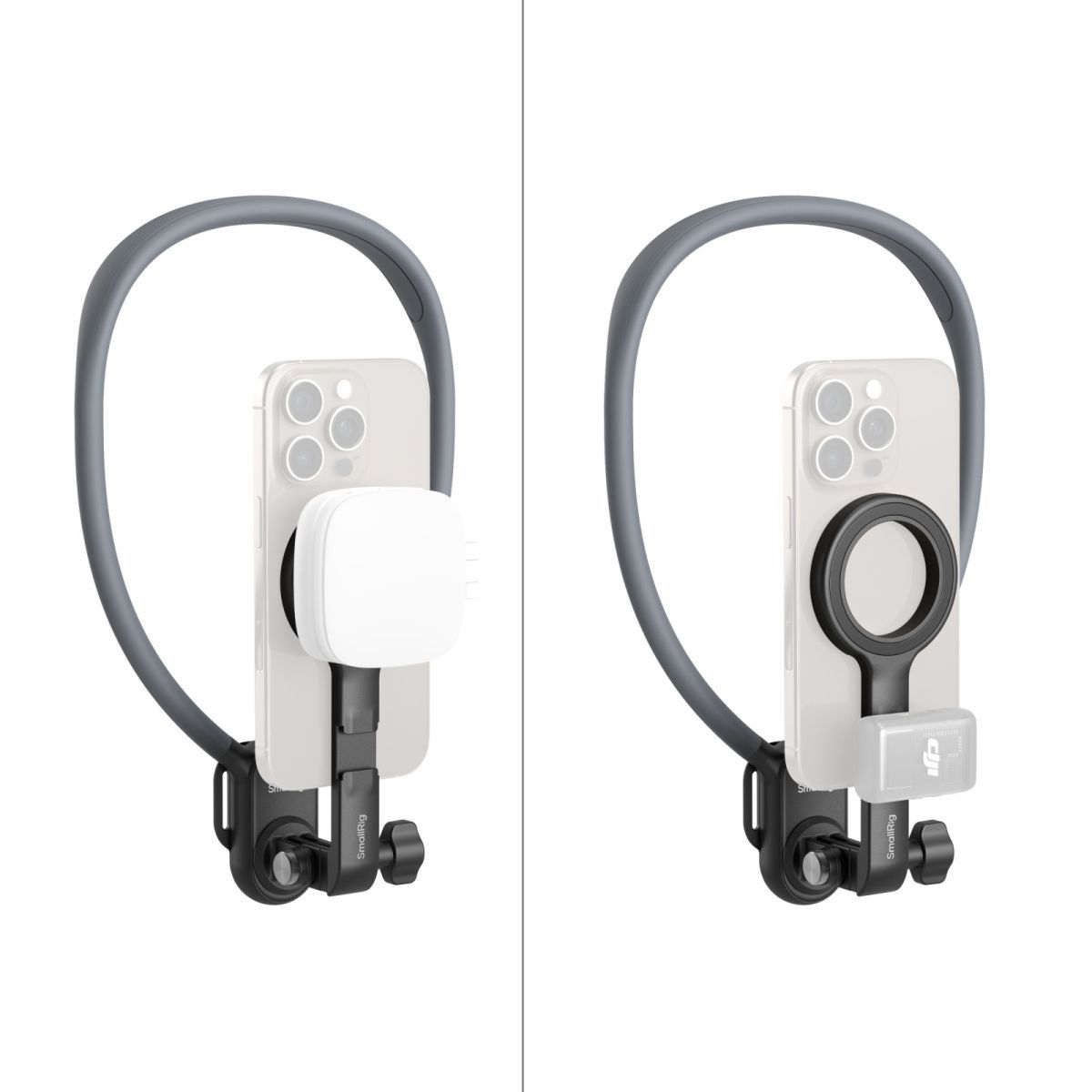 Im Vergleich zu herkömmlichen Smartphone-Halterungen oder Brustgurtsystemen kombiniert der SmallRig 5127 MagSafe Compatible Neck Mount eine magnetische Schnellbefestigung mit ergonomischem Nackendesign. Die Integration von 17 N52-Magneten sowie die zusätzliche Actioncam-Kompatibilität bieten eine vielseitigere Nutzungsmöglichkeit als einfache Halterungen ohne Magnet- oder Adapterlösung.