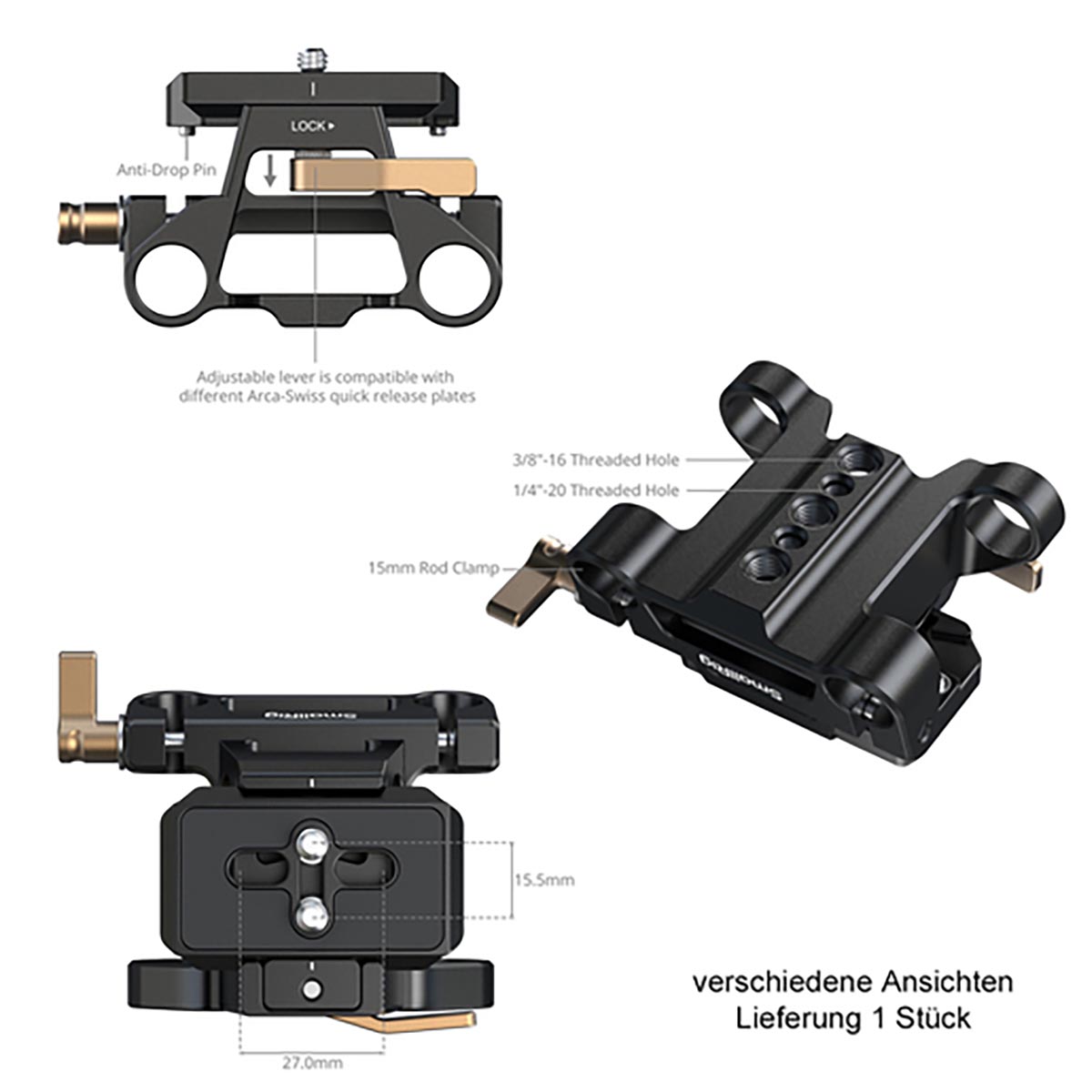 Die vielseitige Montageplattform kombiniert eine integrierte Arca-Swiss-Grundplatte mit einer präzisen 15-mm-Doppelstangenklemme und ermöglicht eine schnelle, stabile Erweiterung professioneller Kamera-Rigs. Durch den einstellbaren Verriegelungshebel, robuste Materialien und die flexible Gewindeausstattung eignet sich das System für Setups mit Follow-Focus, Matte-Boxen und weiteren Rig-Komponenten.
