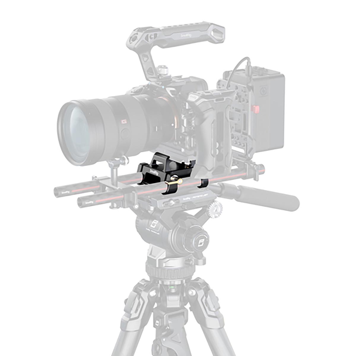 Die doppelte 15-mm-Stabklemme erlaubt das gleichzeitige Arretieren zweier Stangen und erweitert das Rig um Follow-Focus-Systeme, Objektivstützen oder Matte-Boxen. Der doppelte Verriegelungsmechanismus sorgt für eine sichere Fixierung und unterstützt Setups mit professionellem Zubehör.