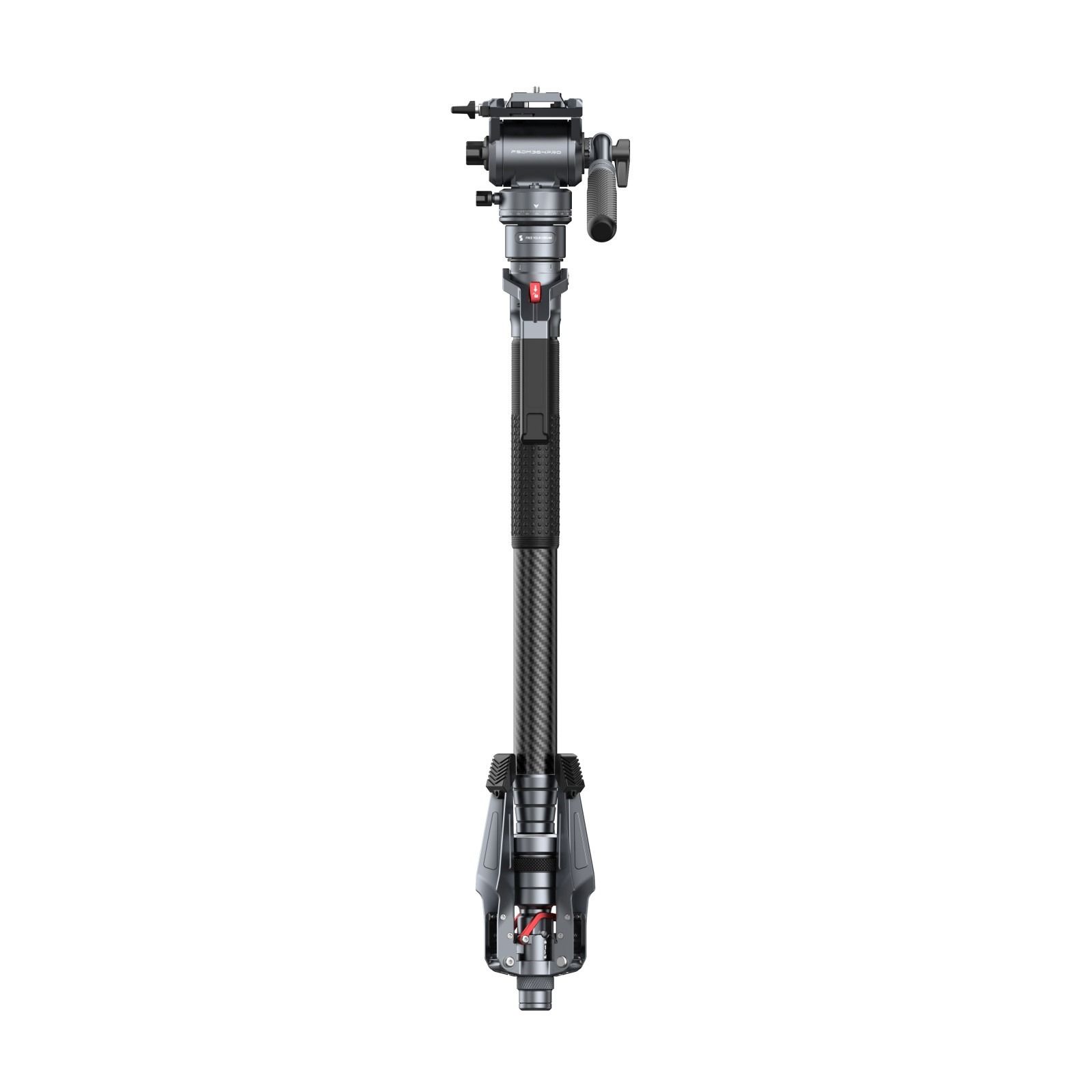 Die 4-teilige Bauweise erreicht eine maximale Arbeitshöhe von 175 cm und lässt sich auf 76 cm zusammenschieben. Mit einem maximalen Rohrdurchmesser von 36 mm bietet das Carbonfaser-Material eine hohe Steifigkeit bei einem Gesamtgewicht von nur ca. 2500 g. Dadurch eignet sich das Video-Einbeinstativ für mobile Produktionen und längere Einsätze.