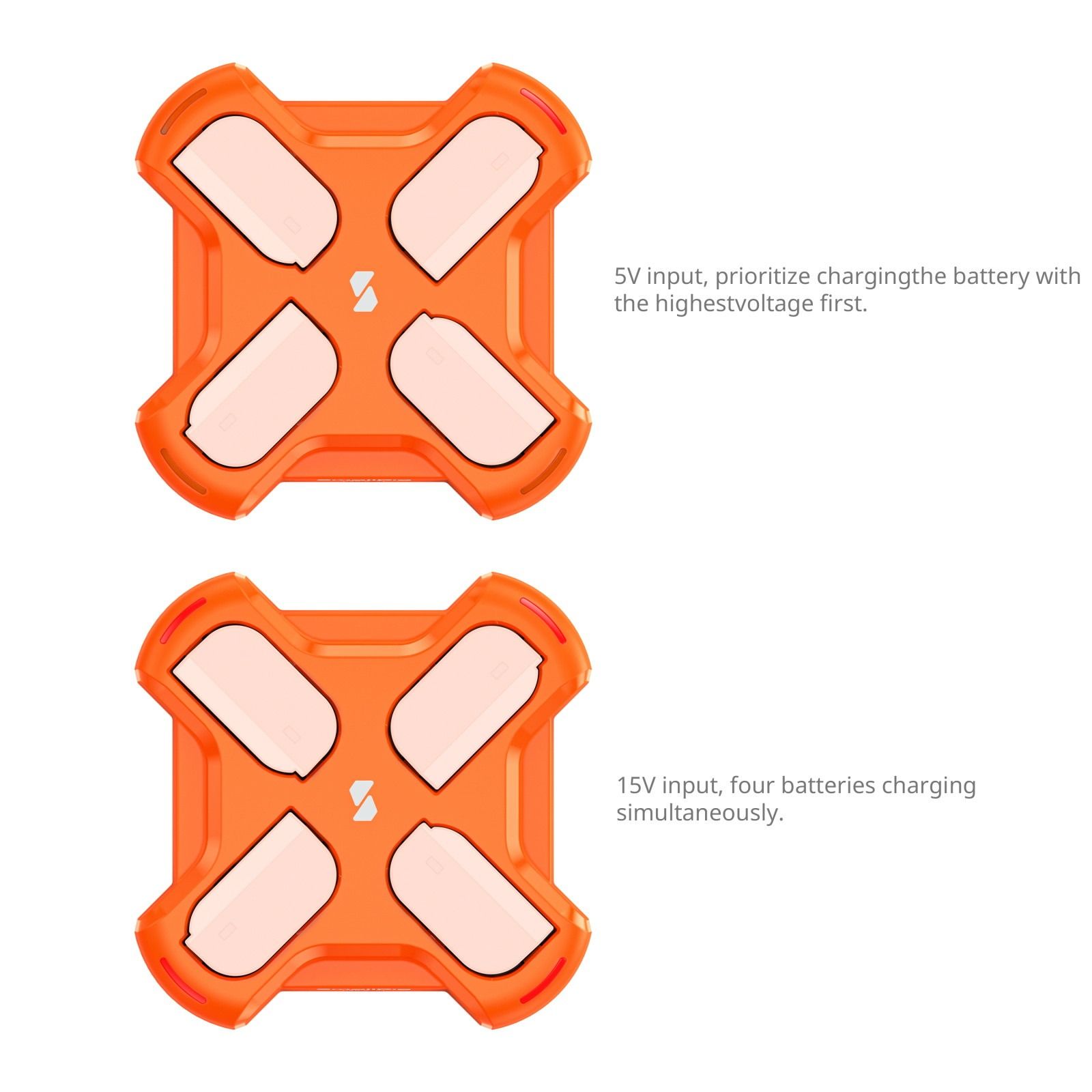 Der SmallRig 5748 Four-Channel Camera Battery Charger für DMW-BLK22 unterstützt 5V, 9V, 12V und 15V Eingangsspannungen, einschließlich 5V/1A Adapter. Je nach verfügbarer Spannung werden automatisch ein bis vier Kanäle aktiviert: 5V aktiviert einen Kanal, 9V zwei, 12V drei und 15V ermöglicht das gleichzeitige Laden aller vier Akkus.