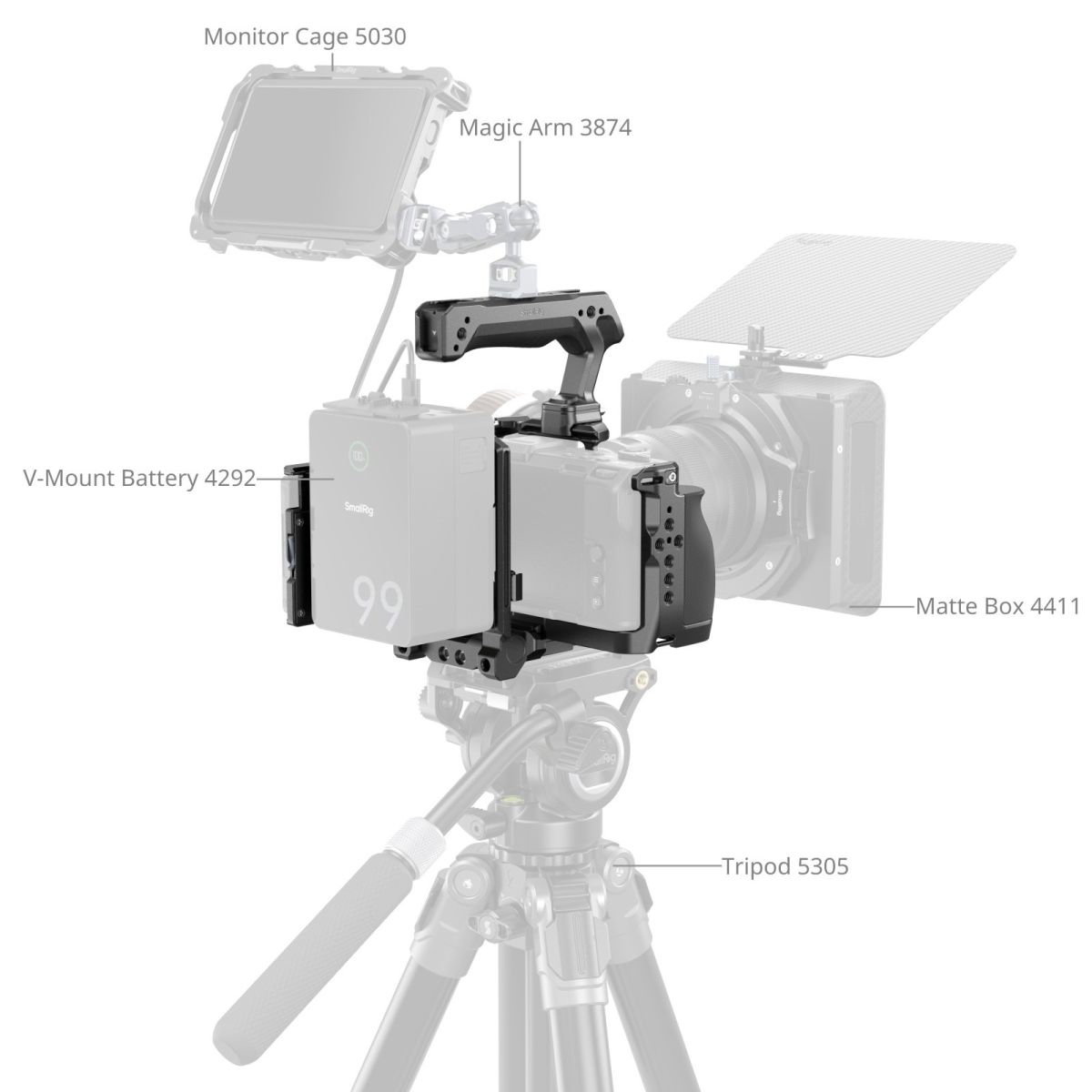 Die integrierte V-Mount-Akkuplatte ermöglicht die Nutzung leistungsstarker V-Mount-Batterien zur Versorgung der Kamera und angeschlossener Zubehörgeräte. Durch die klappbare Konstruktion bleibt das Setup kompakt und transportfreundlich. Dadurch eignet sich das Cage Kit besonders für mobile Filmproduktionen, Dokumentationen oder Run-and-Gun-Situationen, bei denen eine zuverlässige Stromversorgung und schnelle Einsatzbereitschaft erforderlich sind.