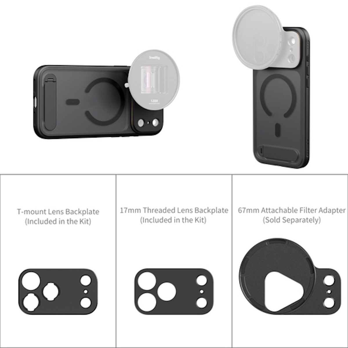 Die Handyhülle unterstützt austauschbare T-Mount- und 17-mm-Gewinderückwände sowie optionale FilMov 67-mm-Aufsteckfilteradapter für magnetische Filter.