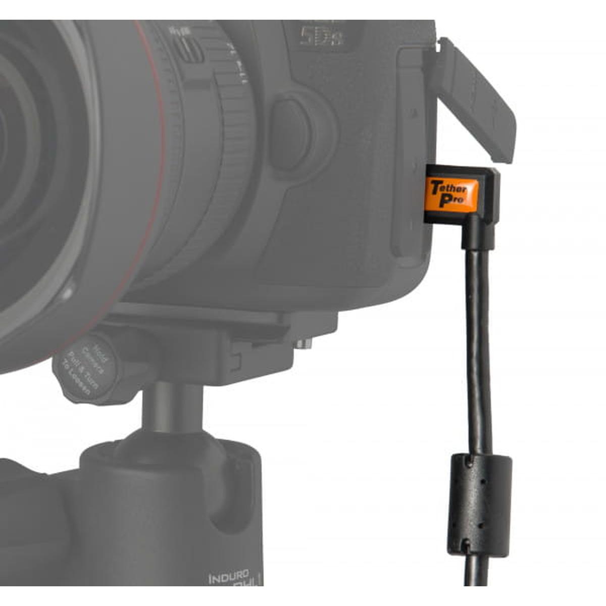 Der rechtsgewinkelte USB 3.0 Micro-B-Stecker des Tether Tools TetherPro USB-Datenkabels ist darauf ausgelegt, eine platzsparende Verbindung an der Kamera zu ermöglichen. Dies verbessert die Handhabung, indem das Kabel geradlinig nach unten verläuft und nicht in einem großen Bogen von der Kamera wegführt. Diese Funktion ist besonders vorteilhaft in Studios oder bei Aufnahmen in beengten Räumen.
