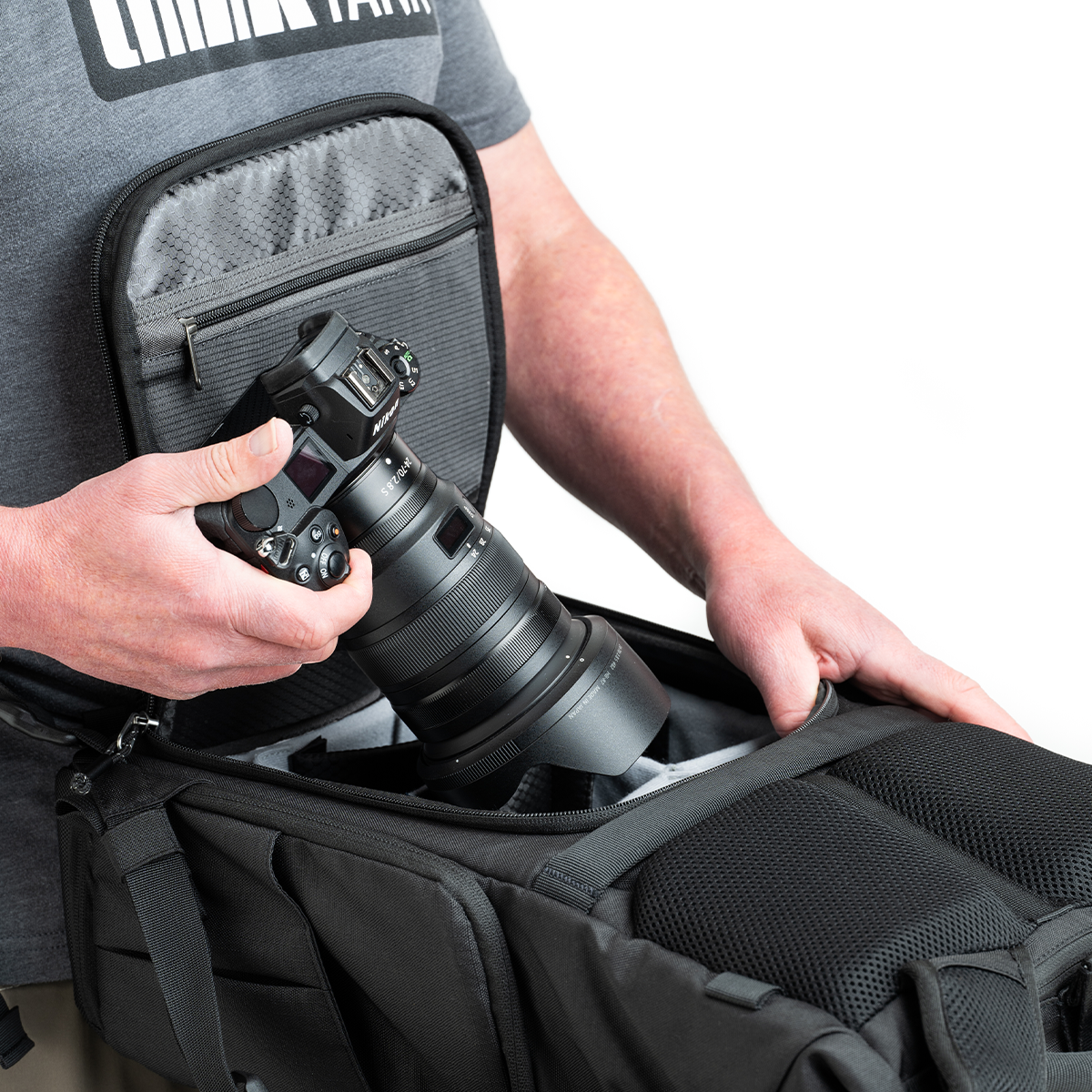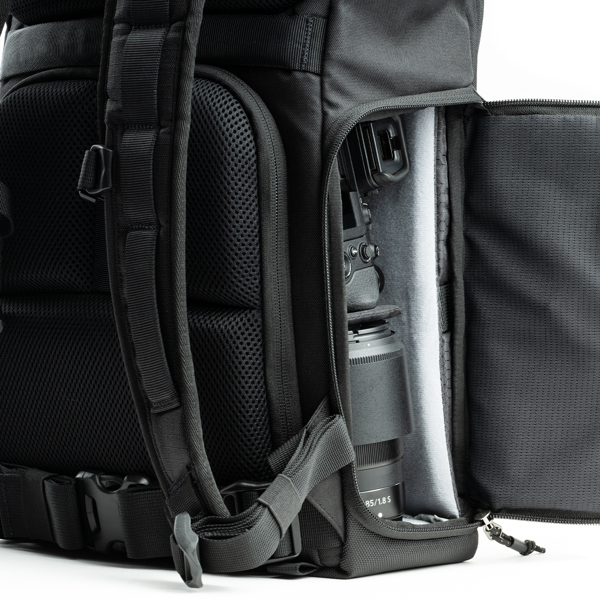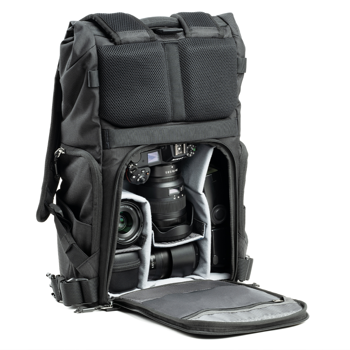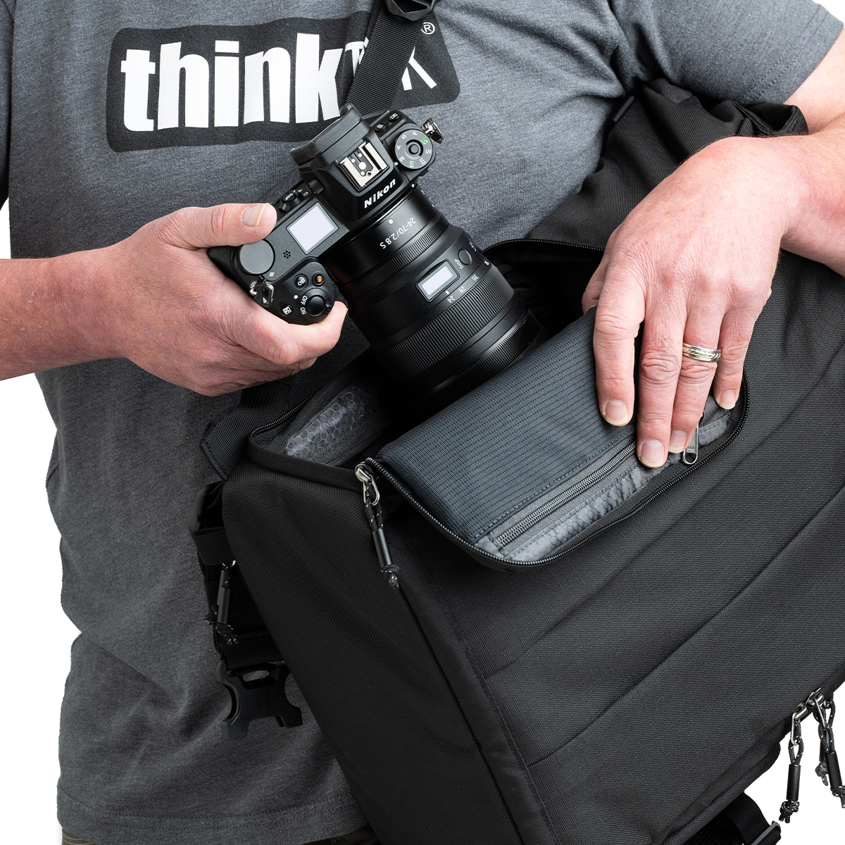 Über seitliche und rückseitige Öffnungen bietet der ThinkTank Focus Point Rolltop-Rucksack 22L Asphalt Black einen direkten und schnellen Zugriff auf Kamera und Zubehör. Dies erleichtert spontane Aufnahmen und sorgt für eine effiziente Nutzung.