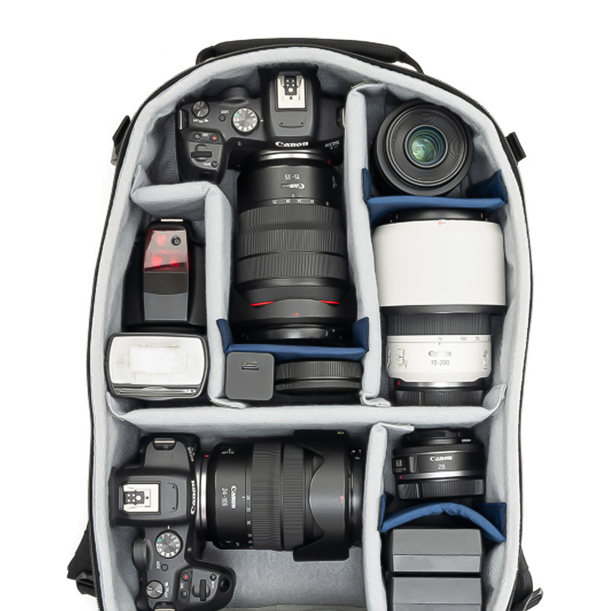 Die variabel einsetzbaren Trennwände ermöglichen eine präzise Anpassung des Innenraums an unterschiedliche Kamerakonfigurationen. Dadurch kann der Rucksack sowohl für Fotoausrüstung als auch als kombinierter Kamera- und Alltagsrucksack genutzt werden.