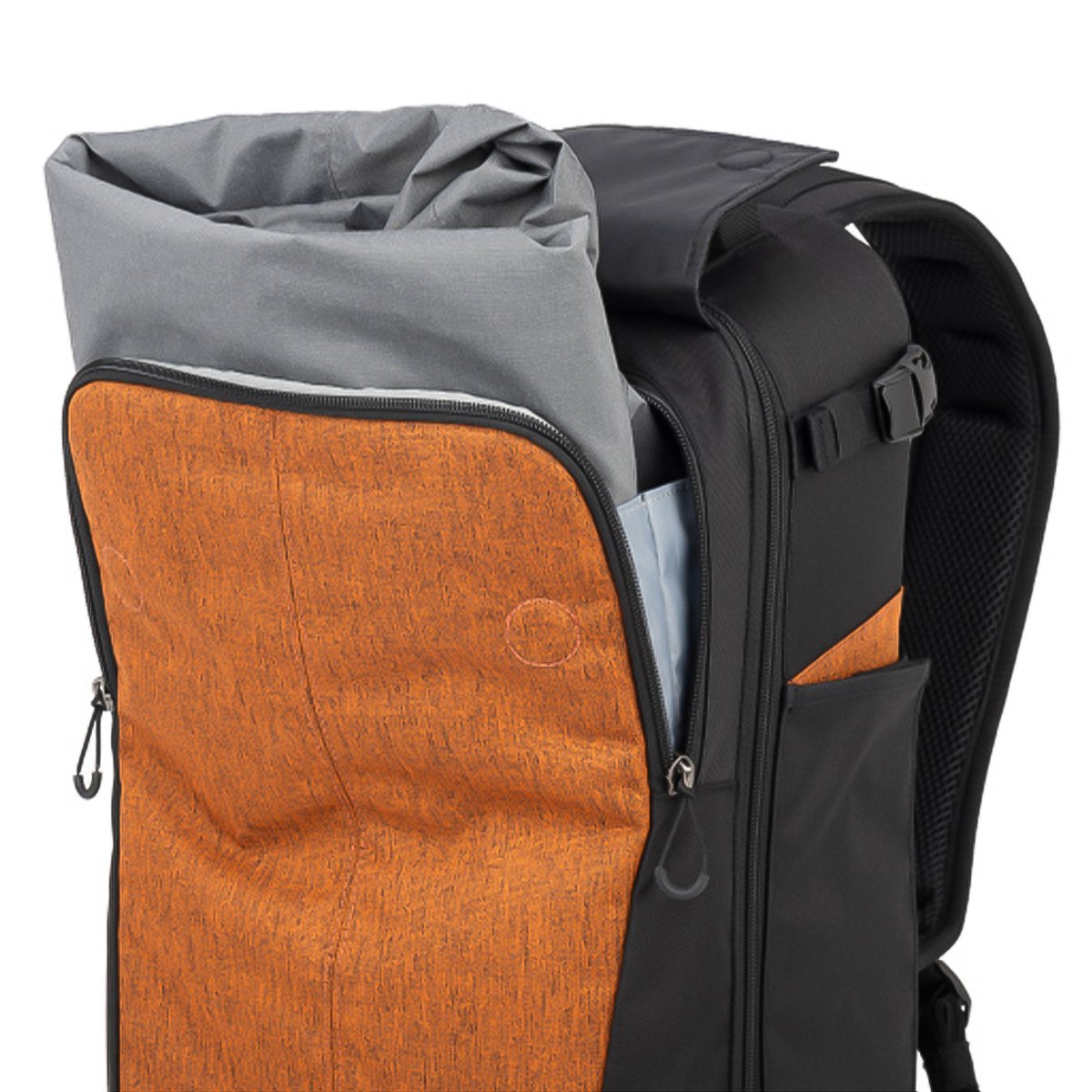 Der Frontzugang erlaubt einen schnellen Zugriff auf die Ausrüstung. Ergänzt wird dies durch eine durchsichtige Reißverschlusstasche sowie erweiterbare Seitentaschen für Wasserflaschen oder kompakte Stative.