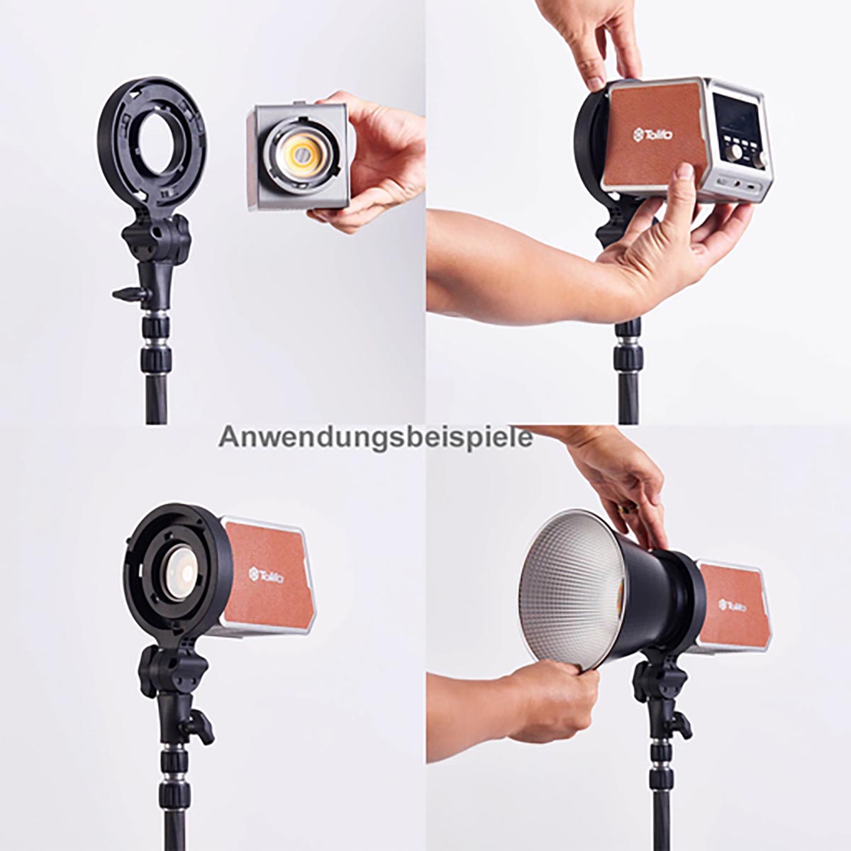 Der Tolifo Bowens Adapter erlaubt die Verwendung von Standard-Bowens-Lichtformern mit Leuchten der Tolifo PL-Palm LED Serie. Dies erweitert die Einsatzmöglichkeiten der kompakten LED-Leuchten erheblich und ermöglicht den schnellen Wechsel zwischen verschiedenen Lichtformern.