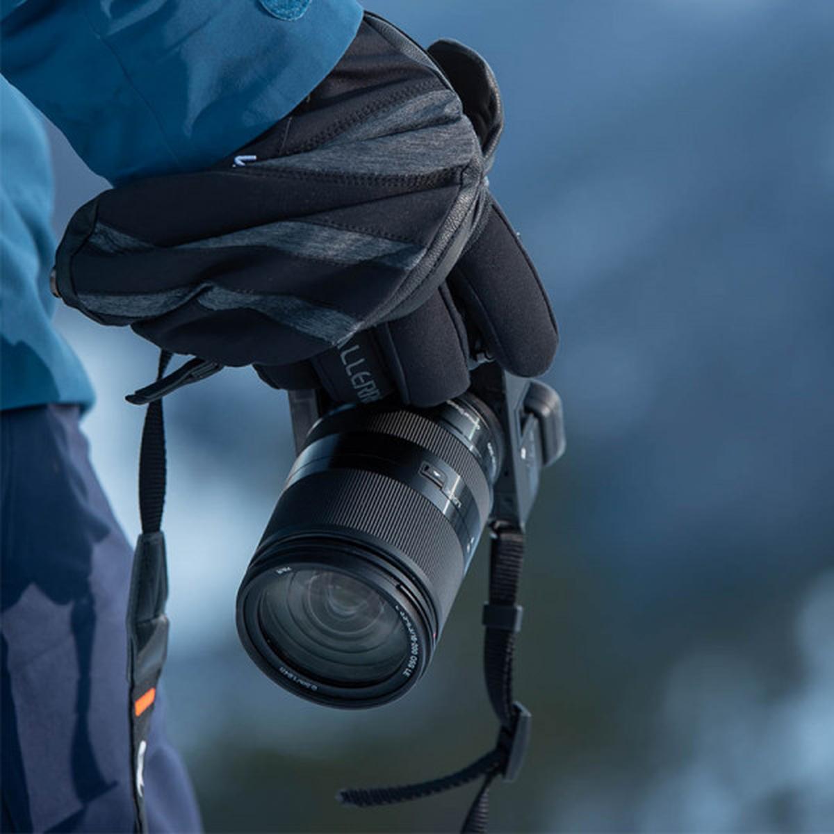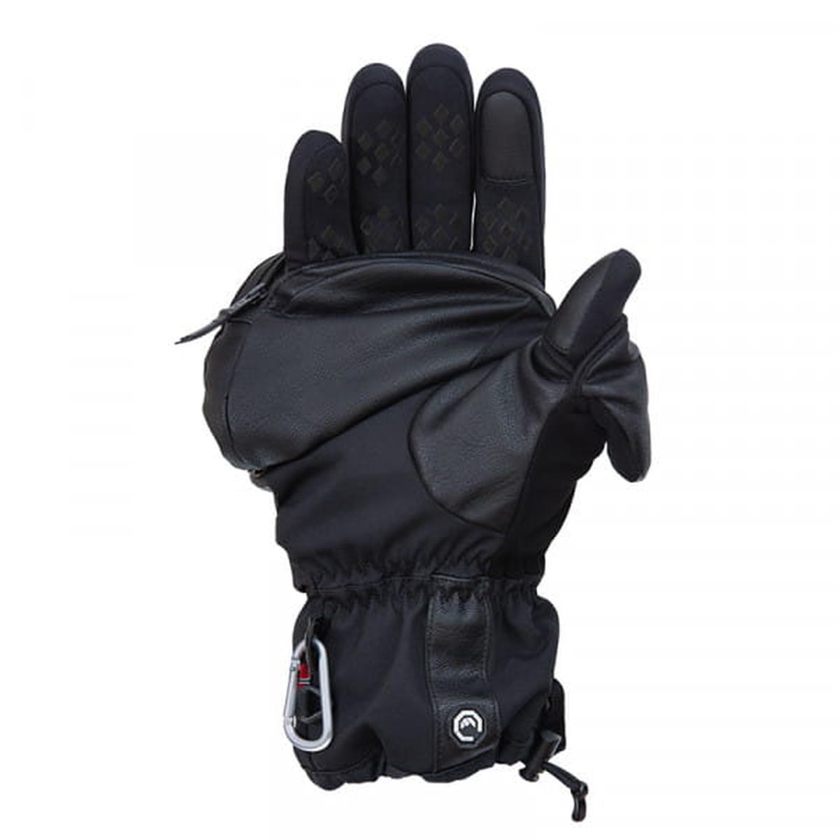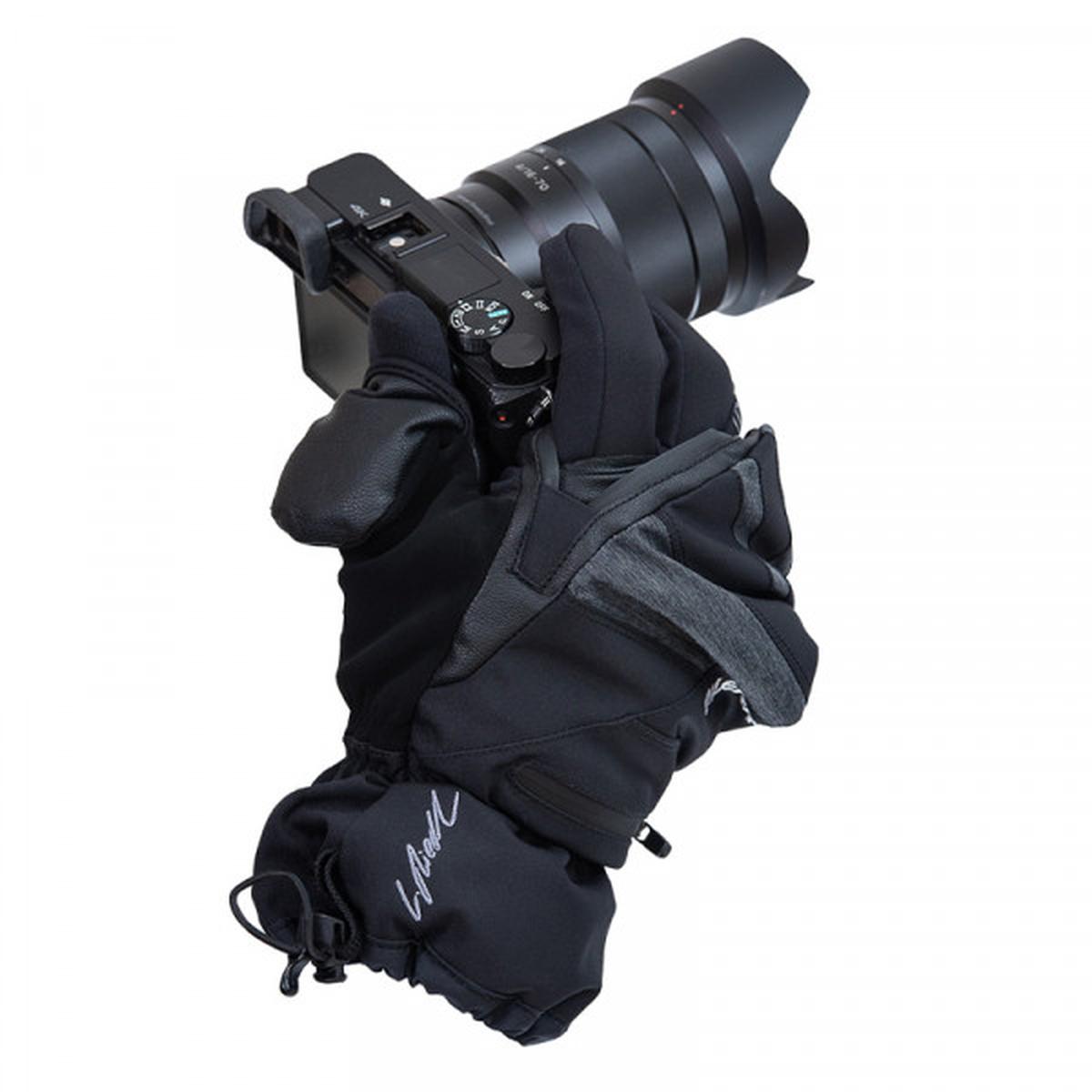 Die FlipTech-Kappen am Daumen und an den Fingern lassen sich umklappen und mithilfe eingenähter Magnete fixieren. So bleiben die Finger beweglich, während die Kappen schnell wieder geschlossen werden können, um Wärme zu speichern – perfekt für Fotografen, die häufig zwischen Bedienung und Schutz wechseln müssen.
