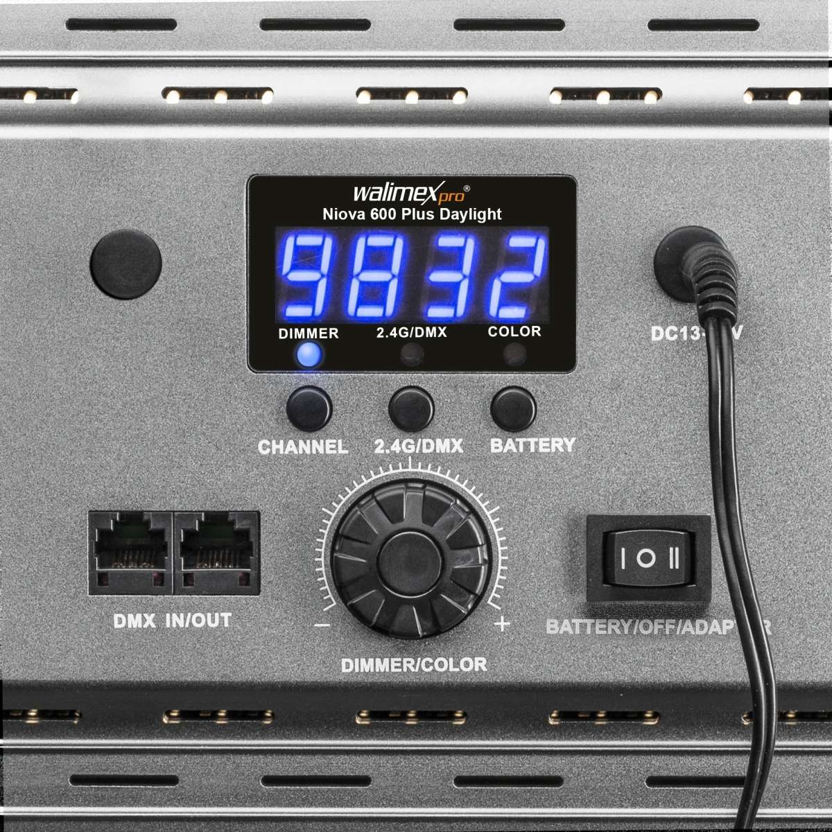 Durch die bereits im Lieferumfang enthaltene 2,4 GHz Funkfernbedienung lässt sich diese Dauerleuchte einfach und überaus bequem fernsteuern. Problemlos lassen sich mehrere Leuchten der Niova Serie mit nur einer Fernbedienung gleichzeitig oder auch einzeln und in Gruppen steuern. Dank 99 Kanälen und einer geräteübergreifenden Kompatibilität innerhalb der Niova Plus Leuchtenserie ist der Umgang mit der Niova 600 Plus Daylight somit sehr einfach und bequem. Die eingestellten Werte lassen sich direkt am Gerät und an der Fernbedienung an den beleuchteten Displays ablesen.