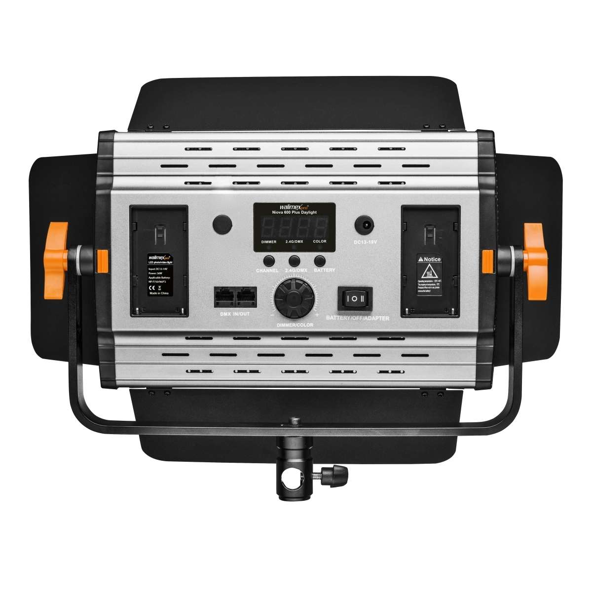 - 2x NP-F Akku Steckplätze, DMX-Steuerungsbuchsen und Fernbedienung für alle Funktionen