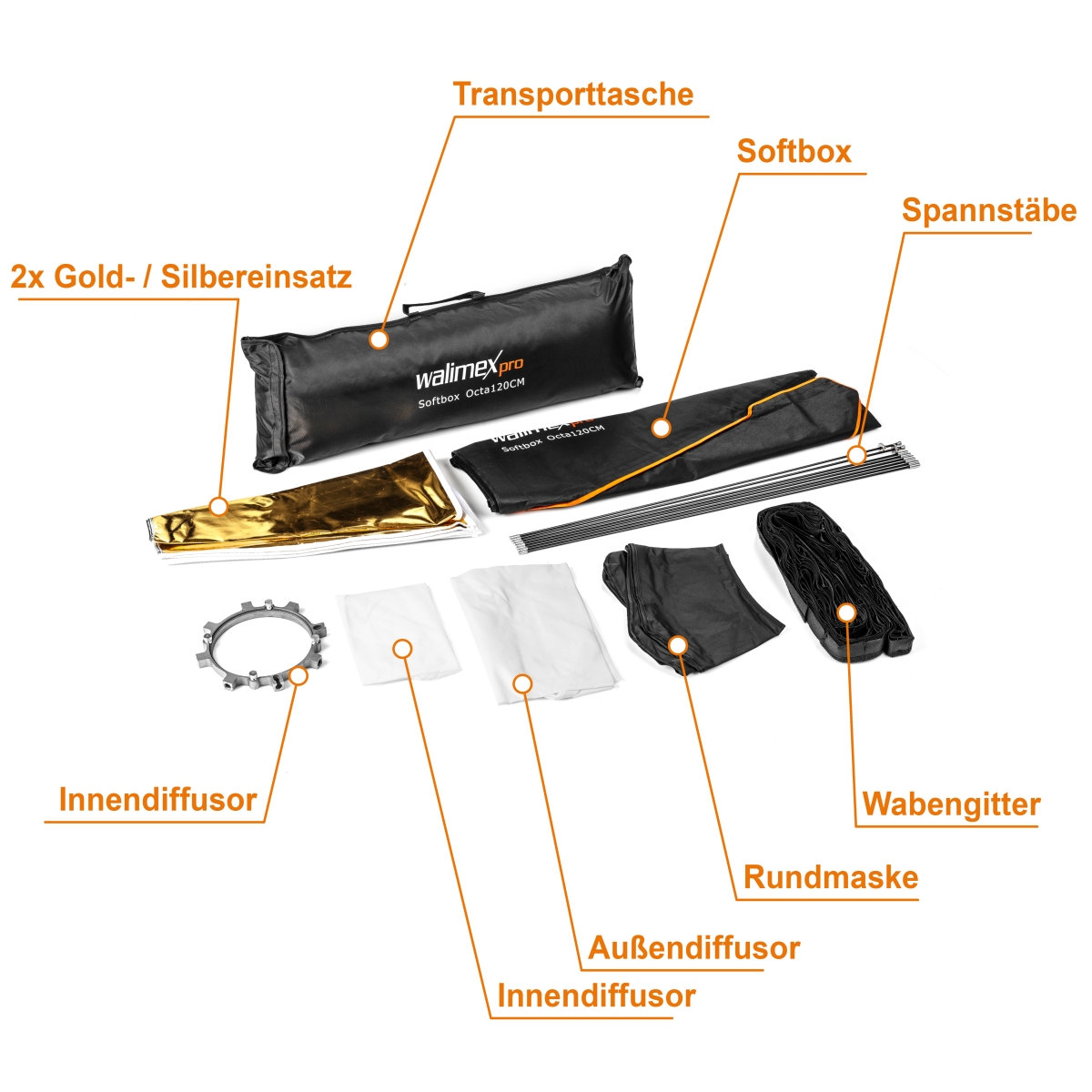 1x Walimex pro Octagon Softbox PLUS Orange Line 120, bestehend aus: