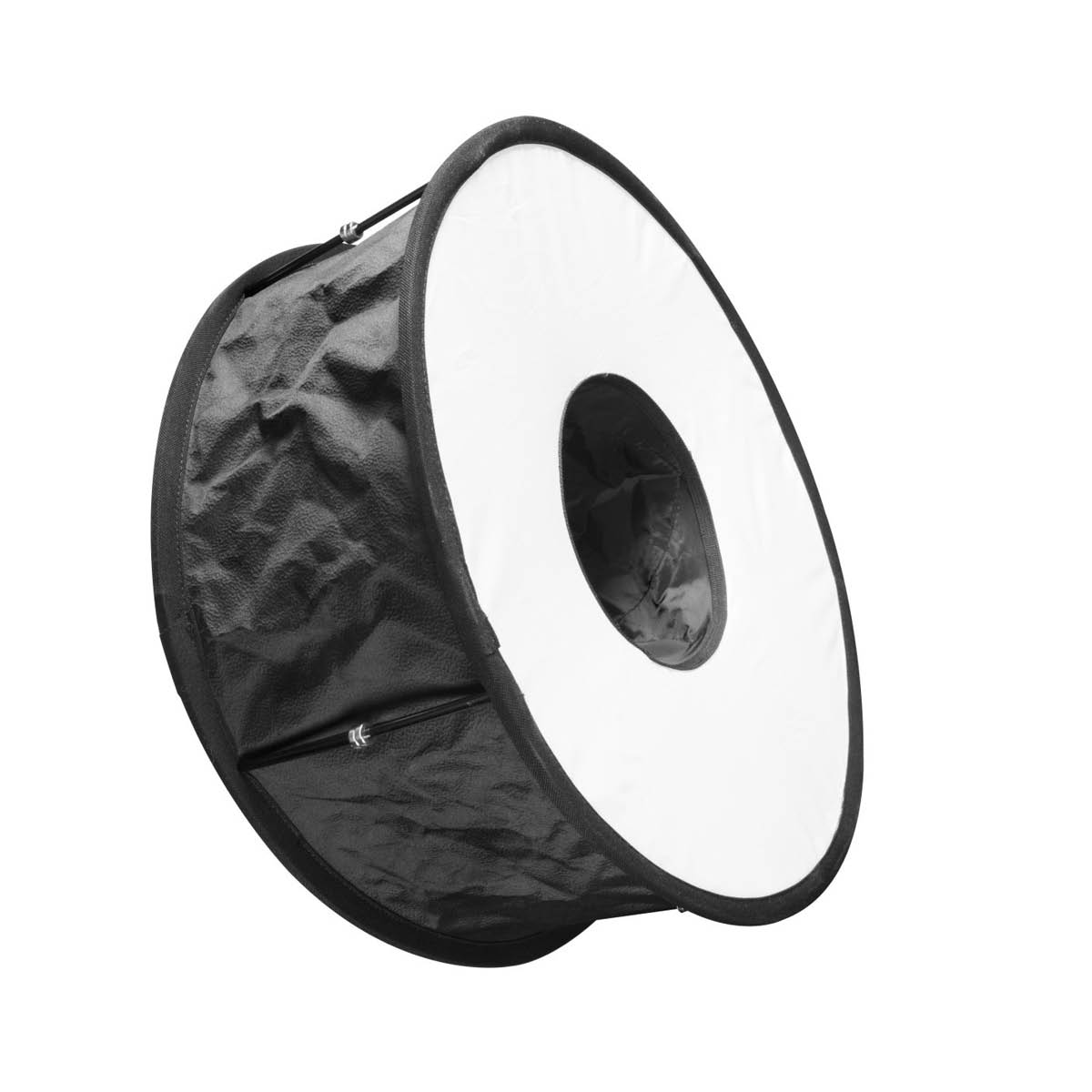 Mit einem Durchmesser von 46 cm cm ist die RoundLight Softbox der perfekte Ringblitz-Diffusor. Die große, gleichmäßig ausgeleuchtete Oberfläche umgibt Ihr Kameraobjektiv komplett und produziert nahezu schattenfreie Bilder. Durch die großen Abmessungen wird das Licht des Aufsteckblitzes durch einen inneren Diffusor in der RoundLight Softbox so geschickt reflektiert, dass eine absolut gleichmäßige Lichtverteilung gewährleistet ist. Das Ergebnis ist eine extrem gleichmäßige und weiche Ausleuchtung.