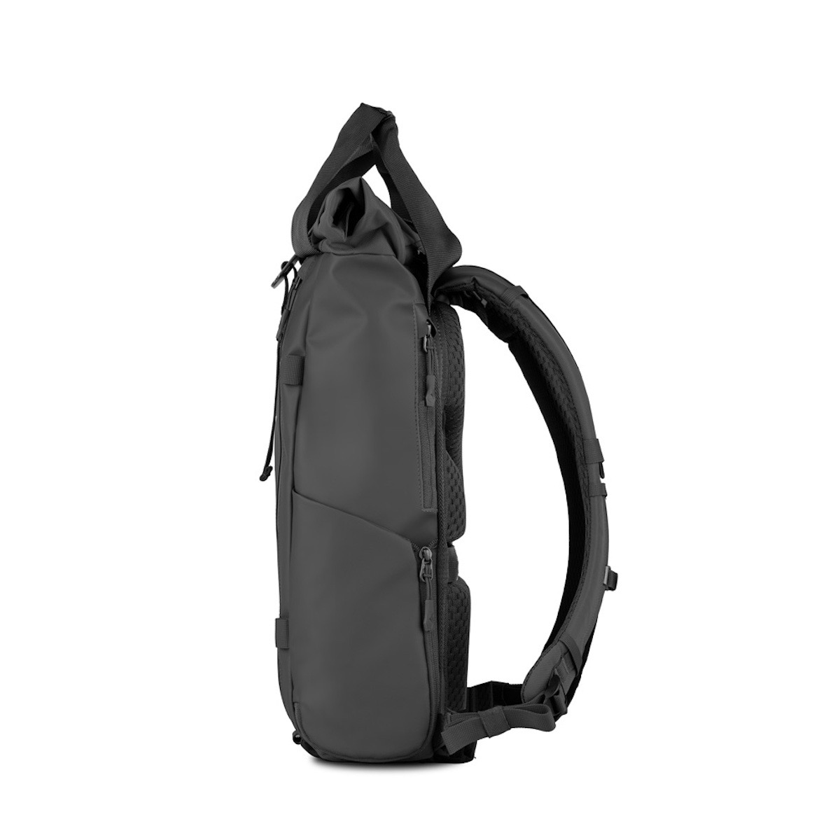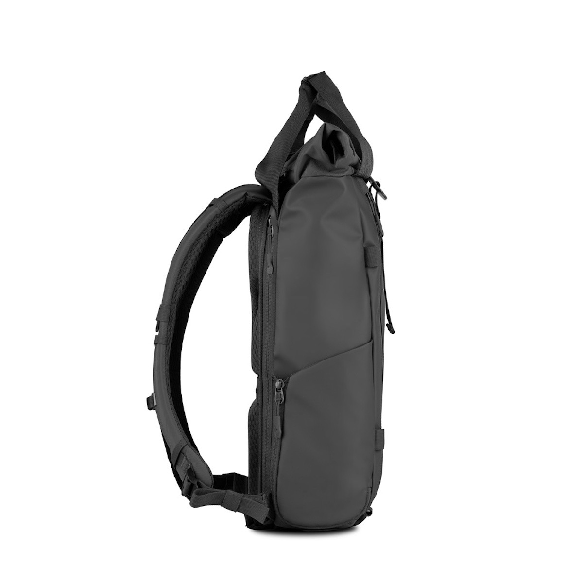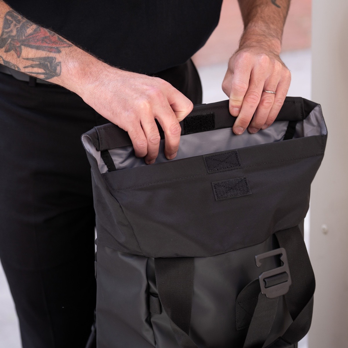 Der Rucksack bietet zwei Hauptzugänge: einen seitlichen Reißverschluss für schnellen Zugriff sowie ein Rolltop mit Magnetschnalle für zusätzliche Sicherheit und erweiterbares Volumen.