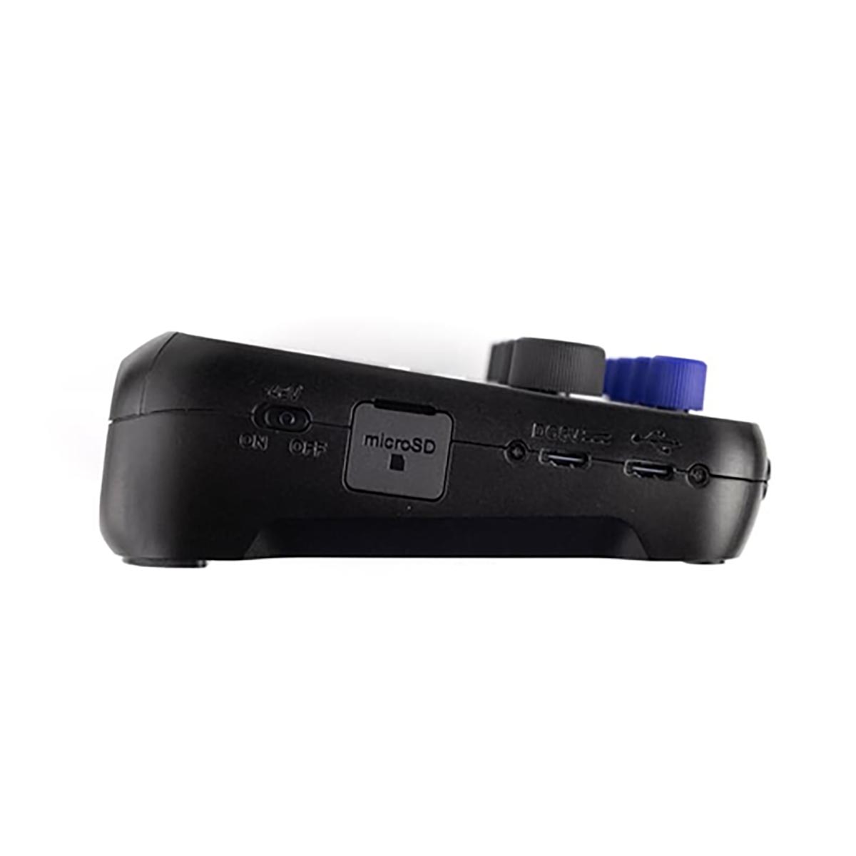 Das kompakte Gehäuse mit ca. 300 g Gewicht erleichtert den mobilen Einsatz. Der Betrieb ist über AA-Batterien, Powerbanks oder Netzteil möglich. Die intuitive Bedienoberfläche wird durch die Sprachführung unterstützt, die Menüs und Funktionen akustisch erklärt. Vier belegbare Sound-Pads ermöglichen das spontane Einspielen von Effekten oder Intros.
