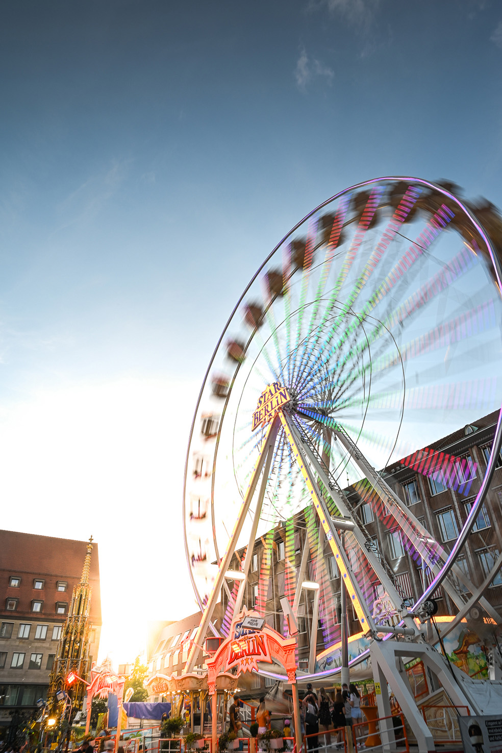 Der vierte Tipp ist, mit dem „Zeit-Modus“ zu spielen – dieser Tipp gilt nicht nur für die unbemerkte Fotografie, sondern spielt auch in anderen Bereichen der Fotografie eine große Rolle. Der „Zeit-Modus“, also die Blendenautomatik S an Ihrer Kamera, wird häufig unterschätzt. In diesem Modus können Sie Ihre Kamera eine gewisse Zeit vorgeben. Egal, ob Sie Bewegungen einfrieren oder verwischen möchten, es ist immer ein schöner Effekt, die Zeit in Ihren Aufnahmen sichtbar zu machen. Sie können die Zeit beispielsweise sichtbar machen, indem Sie ein sich bewegendes Element mithilfe einer längeren Belichtungszeit verwischen. Das funktioniert zum einen gut bei Menschen, die durch Ihren Bildausschnitt laufen oder bei anderen Objekten in Bewegung wie z.B. einem Riesenrad oder einem Kettenkarussell.